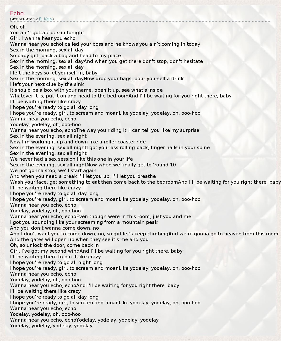 Oh, oh You ain't gotta clock-in tonight Girl, I wanna hear you echo Wanna hear you echoI called your boss and he knows you ain't coming in today Sex in the morning, sex all day So baby girl, pack a bag and head to my place Sex in the morning, sex all dayAnd when you get there don't stop, don't hesitate Sex in the morning, sex all day I left the keys so let yourself in, baby Sex in the morning, sex all dayNow drop your bags, pour yourself a drink I left your next clue by the sink It should be a box with your name, open it up, see what's inside Whatever it is, put it on and head to the bedroomAnd I'll be waiting for you right there, baby I'll be waiting there like crazy I hope you're ready to go all day long I hope you're ready, girl, to scream and moanLike yodelay, yodelay, oh, ooo-hoo Wanna hear you echo, echo Yodelay, yodelay, oh, ooo-hoo Wanna hear you echo, echoThe way you riding it, I can tell you like my surprise Sex in the evening, sex all night Now I'm working it up and down like a roller coaster ride Sex in the evening, sex all nightI got your ass rolling back, finger nails in your spine Sex in the evening, sex all night We never had a sex session like this one in your life Sex in the evening, sex all nightNow when we finally get to 'round 10 We not gonna stop, we'll start again And when you need a break I'll let you up, I'll let you breathe Wash your face, get something to eat then come back to the bedroomAnd I'll be waiting for you right there, baby I'll be waiting there like crazy I hope you're ready to go all day long I hope you're ready, girl, to scream and moanLike yodelay, yodelay, oh, ooo-hoo Wanna hear you echo, echo Yodelay, yodelay, oh, ooo-hoo Wanna hear you echo, echoEven though were in this room, just you and me I got you sounding like your screaming from a mountain peak And you don't wanna come down, no And I don't want you to come down, no, so girl let's keep climbingAnd we're gonna go to heaven from this room And the gates will open up when they see it's me and you Oh, so unlock the door, come back in Girl, I've got my second windAnd I'll be waiting for you right there, baby I'll be waiting there to pin it like crazy I hope you're ready to go all night long I hope you're ready, girl, to scream and moanLike yodelay, yodelay, oh, ooo-hoo Wanna hear you echo, echo Yodelay, yodelay, oh, ooo-hoo Wanna hear you echo, echoAnd I'll be waiting for you right there, baby I'll be waiting there like crazy I hope you're ready to go all day long I hope you're ready, girl, to scream and moanLike yodelay, yodelay, oh, ooo-hoo Wanna hear you echo, echo Yodelay, yodelay, oh, ooo-hoo Wanna hear you echo, echoYodelay, yodelay, yodelay, yodelay Yodelay, yodelay, yodelay, yodelay