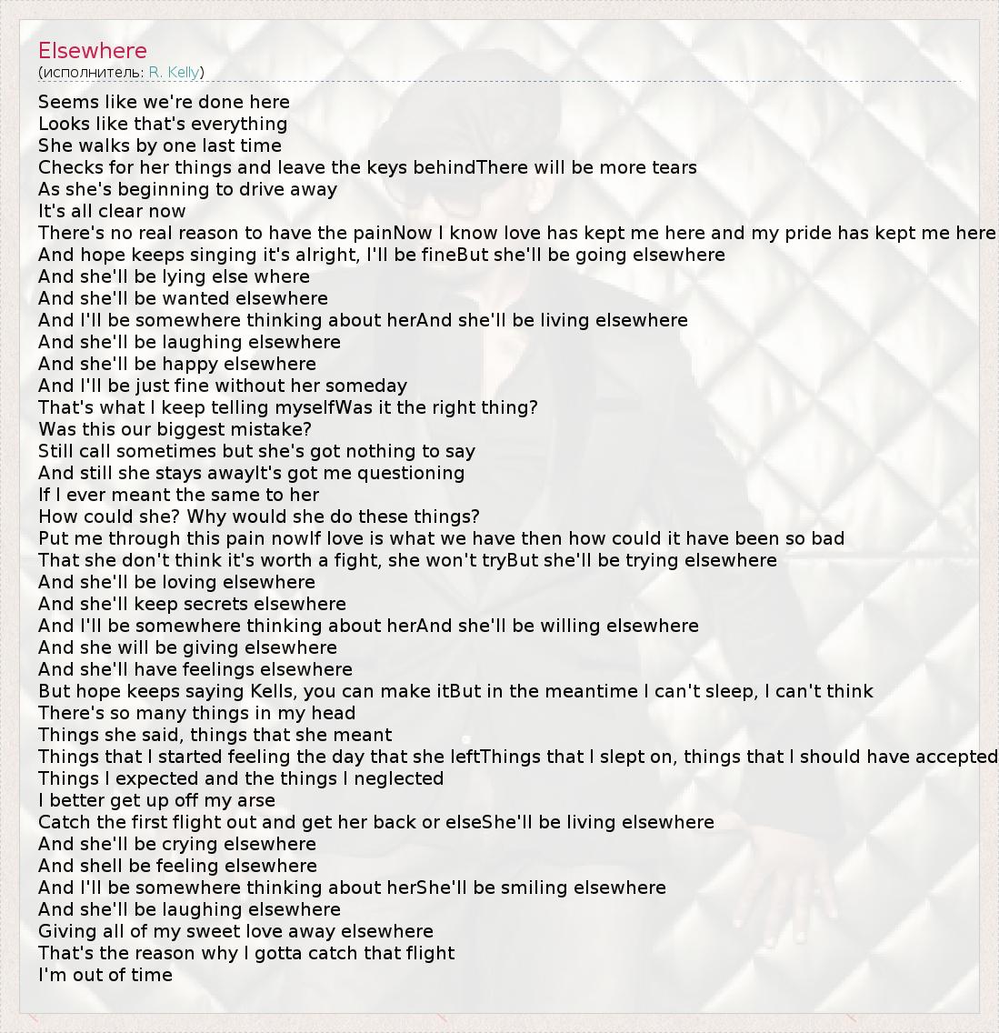 Seems like we're done here Looks like that's everything She walks by one last time Checks for her things and leave the keys behindThere will be more tears As she's beginning to drive away It's all clear now There's no real reason to have the painNow I know love has kept me here and my pride has kept me here And hope keeps singing it's alright, I'll be fineBut she'll be going elsewhere And she'll be lying else where And she'll be wanted elsewhere And I'll be somewhere thinking about herAnd she'll be living elsewhere And she'll be laughing elsewhere And she'll be happy elsewhere And I'll be just fine without her someday That's what I keep telling myselfWas it the right thing? Was this our biggest mistake? Still call sometimes but she's got nothing to say And still she stays awayIt's got me questioning If I ever meant the same to her How could she? Why would she do these things? Put me through this pain nowIf love is what we have then how could it have been so bad That she don't think it's worth a fight, she won't tryBut she'll be trying elsewhere And she'll be loving elsewhere And she'll keep secrets elsewhere And I'll be somewhere thinking about herAnd she'll be willing elsewhere And she will be giving elsewhere And she'll have feelings elsewhere But hope keeps saying Kells, you can make itBut in the meantime I can't sleep, I can't think There's so many things in my head Things she said, things that she meant Things that I started feeling the day that she leftThings that I slept on, things that I should have accepted Things I expected and the things I neglected I better get up off my arse Catch the first flight out and get her back or elseShe'll be living elsewhere And she'll be crying elsewhere And shell be feeling elsewhere And I'll be somewhere thinking about herShe'll be smiling elsewhere And she'll be laughing elsewhere Giving all of my sweet love away elsewhere That's the reason why I gotta catch that flight I'm out of time