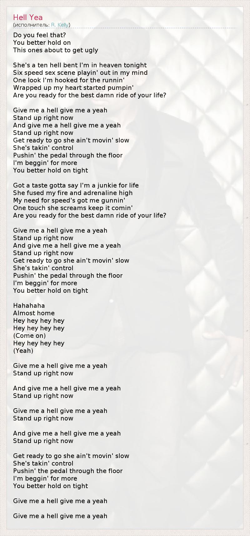 Чувствуешь ли ты, Что тебе лучше держаться подальше От тех, кто становится уродливее? Она, черт возьми, сделает эту ночь для меня божественной. Шестискоростная сцена любви уже проигрывается в моих мыслях. Один взгляд – и я завелся. Мое захваченное сердце начало колотиться. Ты готова к лучшей ночи в своей жизни? Дай мне "ад", дай мне "да", Поднимись прямо сейчас И дай мне "ад", дай мне "да", Поднимись прямо сейчас. Будь готов, она не будет тормозить, Она берет все под контроль, Надавливая на педаль по максимуму. Я молю о большем. Лучше держись покрепче. Вошел во вкус, нужно заметить, я пожизненный наркоман. Она расплавила мой огонь и высокий уровень адреналина. Необходимость скорости сводит меня с ума. Одно прикосновение – и она кричит, продолжая держать его. Ты готова к лучше ночи в своей жизни? Дай мне "ад", дай мне "да", Поднимись прямо сейчас И дай мне "ад", дай мне "да", Поднимись прямо сейчас. Будь готов, она не будет тормозить, Она берет все под контроль, Надавливая на педаль по максимуму. Я молю о большем. Лучше держись покрепче. Ха-ха-ха-ха, Почти дома! Хей-хей-хей-хей, Хей-хей-хей-хей (Давай же!) Хей-хей-хей-хей (Да!) Дай мне "ад", дай мне "да", Поднимись прямо сейчас. И дай мне "ад", дай мне "да", Поднимись прямо сейчас. Дай мне "ад", дай мне "да", Поднимись прямо сейчас. И дай мне "ад", дай мне "да", Поднимись прямо сейчас. Будь готов, она не будет тормозить, Она берет все под контроль, Надавливая на педаль по максимуму. Я молю о большем. Лучше держись покрепче. Дай мне "ад", дай мне "да". Дай мне "ад", дай мне "да".