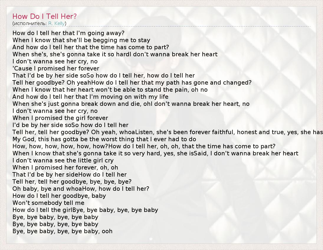 How do I tell her that I'm going away? When I know that she'll be begging me to stay And how do I tell her that the time has come to part? When she's, she's gonna take it so hardI don't wanna break her heart I don't wanna see her cry, no 'Cause I promised her forever That I'd be by her side soSo how do I tell her, how do I tell her Tell her goodbye? Oh yeahHow do I tell her that my path has gone and changed? When I know that her heart won't be able to stand the pain, oh no And how do I tell her that I'm moving on with my life When she's just gonna break down and die, ohI don't wanna break her heart, no I don't wanna see her cry, no When I promised the girl forever I'd be by her side soSo how do I tell her Tell her, tell her goodbye? Oh yeah, whoaListen, she's been forever faithful, honest and true, yes, she has My God, this has gotta be the worst thing that I ever had to do How, how, how, how, how, how?How do I tell her, oh, oh, that the time has come to part? When I know that she's gonna take it so very hard, yes, she isSaid, I don't wanna break her heart I don't wanna see the little girl cry When I promised her forever, oh, oh That I'd be by her sideHow do I tell her Tell her, tell her goodbye, bye, bye, bye? Oh baby, bye and whoaHow, how do I tell her? How do I tell her goodbye, baby Won't somebody tell me How do I tell the girlBye, bye baby, bye, bye baby Bye, bye baby, bye, bye baby Bye, bye baby, bye, bye baby Bye, bye baby, bye, bye baby, ooh