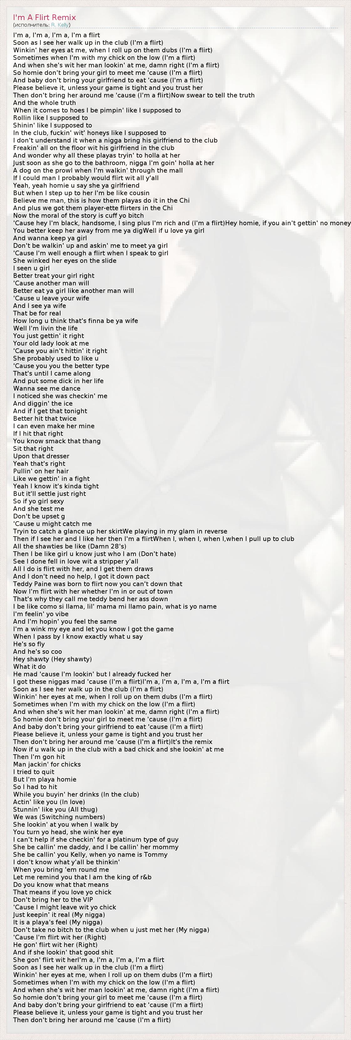 I'm a, I'm a, I'm a, I'm a flirt Soon as I see her walk up in the club (I'm a flirt) Winkin' her eyes at me, when I roll up on them dubs (I'm a flirt) Sometimes when I'm with my chick on the low (I'm a flirt) And when she's wit her man lookin' at me, damn right (I'm a flirt) So homie don't bring your girl to meet me 'cause (I'm a flirt) And baby don't bring your girlfriend to eat 'cause (I'm a flirt) Please believe it, unless your game is tight and you trust her Then don't bring her around me 'cause (I'm a flirt)Now swear to tell the truth And the whole truth When it comes to hoes I be pimpin' like I supposed to Rollin like I supposed to Shinin' like I supposed to In the club, fuckin' wit' honeys like I supposed to I don't understand it when a nigga bring his girlfriend to the club Freakin' all on the floor wit his girlfriend in the club And wonder why all these playas tryin' to holla at her Just soon as she go to the bathroom, nigga I'm goin' holla at her A dog on the prowl when I'm walkin' through the mall If I could man I probably would flirt wit all y'all Yeah, yeah homie u say she ya girlfriend But when I step up to her I'm be like cousin Believe me man, this is how them playas do it in the Chi And plus we got them player-ette flirters in the Chi Now the moral of the story is cuff yo bitch 'Cause hey I'm black, handsome, I sing plus I'm rich and (I'm a flirt)Hey homie, if you ain't gettin' no money You better keep her away from me ya digWell if u love ya girl And wanna keep ya girl Don't be walkin' up and askin' me to meet ya girl 'Cause I'm well enough a flirt when I speak to girl She winked her eyes on the slide I seen u girl Better treat your girl right 'Cause another man will Better eat ya girl like another man will 'Cause u leave your wife And I see ya wife That be for real How long u think that's finna be ya wife Well I'm livin the life You just gettin' it right Your old lady look at me 'Cause you ain't hittin' it right She probably used to like u 'Cause you you the better type That's until I came along And put some dick in her life Wanna see me dance I noticed she was checkin' me And diggin' the ice And if I get that tonight Better hit that twice I can even make her mine If I hit that right You know smack that thang Sit that right Upon that dresser Yeah that's right Pullin' on her hair Like we gettin' in a fight Yeah I know it's kinda tight But it'll settle just right So if yo girl sexy And she test me Don't be upset g 'Cause u might catch me Tryin to catch a glance up her skirtWe playing in my glam in reverse Then if I see her and I like her then I'm a flirtWhen I, when I, when I,when I pull up to club All the shawties be like (Damn 28's) Then I be like girl u know just who I am (Don't hate) See I done fell in love wit a stripper y'all All I do is flirt with her, and I get them draws And I don't need no help, I got it down pact Teddy Paine was born to flirt now you can't down that Now I'm flirt with her whether I'm in or out of town That's why they call me teddy bend her ass down I be like como si llama, lil' mama mi llamo pain, what is yo name I'm feelin' yo vibe And I'm hopin' you feel the same I'm a wink my eye and let you know I got the game When I pass by I know exactly what u say He's so fly And he's so coo Hey shawty (Hey shawty) What it do He mad 'cause I'm lookin' but I already fucked her I got these niggas mad 'cause (I'm a flirt)I'm a, I'm a, I'm a, I'm a flirt Soon as I see her walk up in the club (I'm a flirt) Winkin' her eyes at me, when I roll up on them dubs (I'm a flirt) Sometimes when I'm with my chick on the low (I'm a flirt) And when she's wit her man lookin' at me, damn right (I'm a flirt) So homie don't bring your girl to meet me 'cause (I'm a flirt) And baby don't bring your girlfriend to eat 'cause (I'm a flirt) Please believe it, unless your game is tight and you trust her Then don't bring her around me 'cause (I'm a flirt)It's the remix Now if u walk up in the club with a bad chick and she lookin' at me Then I'm gon hit Man jackin' for chicks I tried to quit But I'm playa homie So I had to hit While you buyin' her drinks (In the club) Actin' like you (In love) Stunnin' like you (All thug) We was (Switching numbers) She lookin' at you when I walk by You turn yo head, she wink her eye I can't help if she checkin' for a platinum type of guy She be callin' me daddy, and I be callin' her mommy She be callin' you Kelly, when yo name is Tommy I don't know what y'all be thinkin' When you bring 'em round me Let me remind you that I am the king of r&b Do you know what that means That means if you love yo chick Don't bring her to the VIP 'Cause I might leave wit yo chick Just keepin' it real (My nigga) It is a playa's feel (My nigga) Don't take no bitch to the club when u just met her (My nigga) 'Cause I'm flirt wit her (Right) He gon' flirt wit her (Right) And if she lookin' that good shit She gon' flirt wit herI'm a, I'm a, I'm a, I'm a flirt Soon as I see her walk up in the club (I'm a flirt) Winkin' her eyes at me, when I roll up on them dubs (I'm a flirt) Sometimes when I'm with my chick on the low (I'm a flirt) And when she's wit her man lookin' at me, damn right (I'm a flirt) So homie don't bring your girl to meet me 'cause (I'm a flirt) And baby don't bring your girlfriend to eat 'cause (I'm a flirt) Please believe it, unless your game is tight and you trust her Then don't bring her around me 'cause (I'm a flirt)