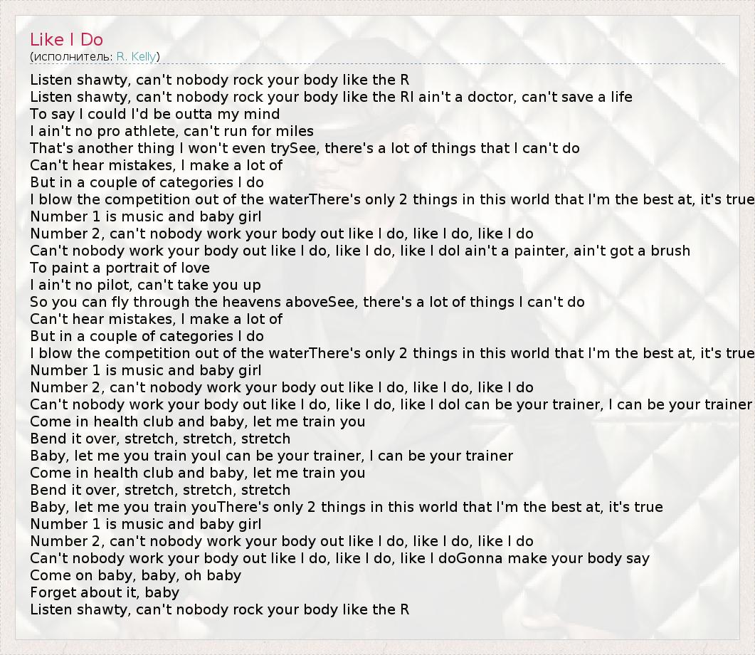 Listen shawty, can't nobody rock your body like the R Listen shawty, can't nobody rock your body like the RI ain't a doctor, can't save a life To say I could I'd be outta my mind I ain't no pro athlete, can't run for miles That's another thing I won't even trySee, there's a lot of things that I can't do Can't hear mistakes, I make a lot of But in a couple of categories I do I blow the competition out of the waterThere's only 2 things in this world that I'm the best at, it's true Number 1 is music and baby girl Number 2, can't nobody work your body out like I do, like I do, like I do Can't nobody work your body out like I do, like I do, like I doI ain't a painter, ain't got a brush To paint a portrait of love I ain't no pilot, can't take you up So you can fly through the heavens aboveSee, there's a lot of things I can't do Can't hear mistakes, I make a lot of But in a couple of categories I do I blow the competition out of the waterThere's only 2 things in this world that I'm the best at, it's true Number 1 is music and baby girl Number 2, can't nobody work your body out like I do, like I do, like I do Can't nobody work your body out like I do, like I do, like I doI can be your trainer, I can be your trainer Come in health club and baby, let me train you Bend it over, stretch, stretch, stretch Baby, let me you train youI can be your trainer, I can be your trainer Come in health club and baby, let me train you Bend it over, stretch, stretch, stretch Baby, let me you train youThere's only 2 things in this world that I'm the best at, it's true Number 1 is music and baby girl Number 2, can't nobody work your body out like I do, like I do, like I do Can't nobody work your body out like I do, like I do, like I doGonna make your body say Come on baby, baby, oh baby Forget about it, baby Listen shawty, can't nobody rock your body like the R