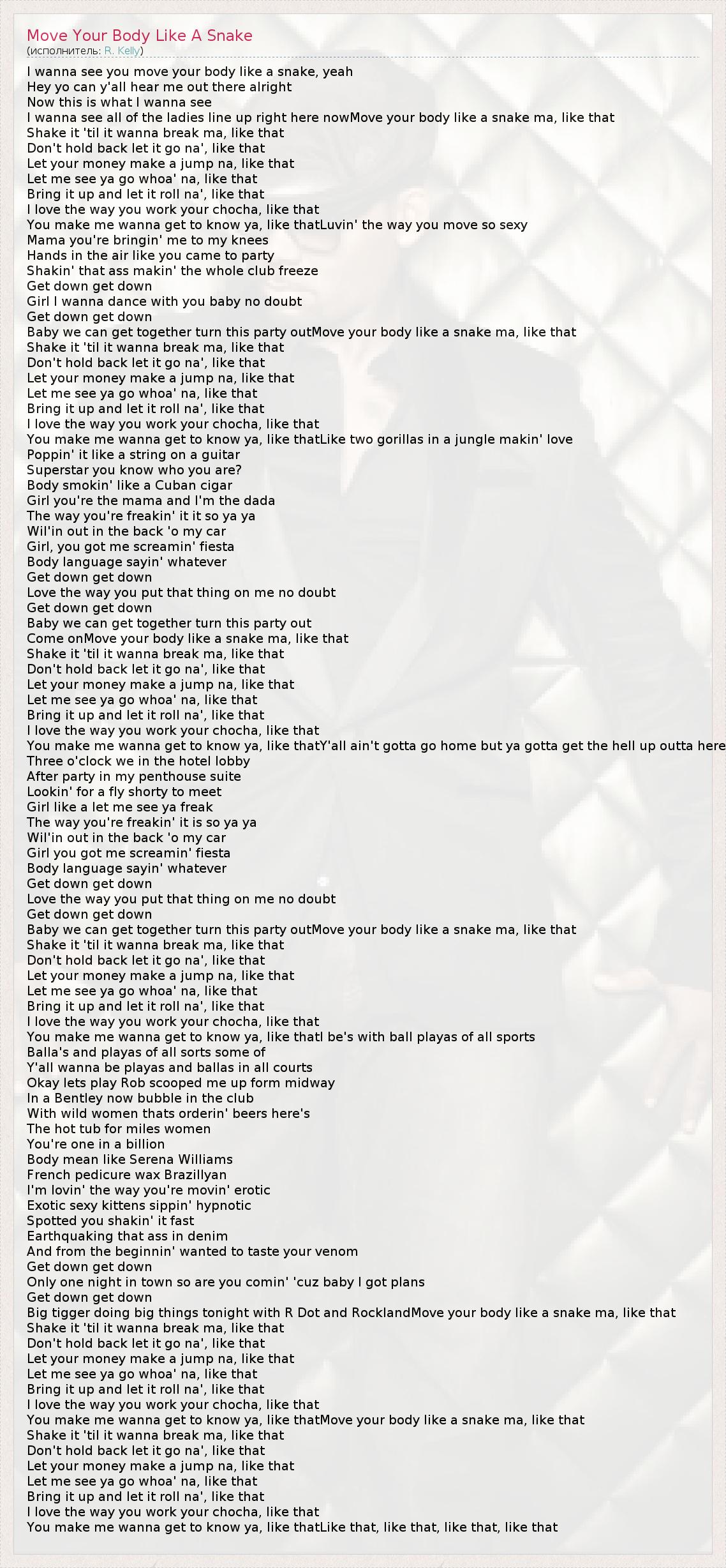 I wanna see you move your body like a snake, yeah Hey yo can y'all hear me out there alright Now this is what I wanna see I wanna see all of the ladies line up right here nowMove your body like a snake ma, like that Shake it 'til it wanna break ma, like that Don't hold back let it go na', like that Let your money make a jump na, like that Let me see ya go whoa' na, like that Bring it up and let it roll na', like that I love the way you work your chocha, like that You make me wanna get to know ya, like thatLuvin' the way you move so sexy Mama you're bringin' me to my knees Hands in the air like you came to party Shakin' that ass makin' the whole club freeze Get down get down Girl I wanna dance with you baby no doubt Get down get down Baby we can get together turn this party outMove your body like a snake ma, like that Shake it 'til it wanna break ma, like that Don't hold back let it go na', like that Let your money make a jump na, like that Let me see ya go whoa' na, like that Bring it up and let it roll na', like that I love the way you work your chocha, like that You make me wanna get to know ya, like thatLike two gorillas in a jungle makin' love Poppin' it like a string on a guitar Superstar you know who you are? Body smokin' like a Cuban cigar Girl you're the mama and I'm the dada The way you're freakin' it it so ya ya Wil'in out in the back 'o my car Girl, you got me screamin' fiesta Body language sayin' whatever Get down get down Love the way you put that thing on me no doubt Get down get down Baby we can get together turn this party out Come onMove your body like a snake ma, like that Shake it 'til it wanna break ma, like that Don't hold back let it go na', like that Let your money make a jump na, like that Let me see ya go whoa' na, like that Bring it up and let it roll na', like that I love the way you work your chocha, like that You make me wanna get to know ya, like thatY'all ain't gotta go home but ya gotta get the hell up outta here Three o'clock we in the hotel lobby After party in my penthouse suite Lookin' for a fly shorty to meet Girl like a let me see ya freak The way you're freakin' it is so ya ya Wil'in out in the back 'o my car Girl you got me screamin' fiesta Body language sayin' whatever Get down get down Love the way you put that thing on me no doubt Get down get down Baby we can get together turn this party outMove your body like a snake ma, like that Shake it 'til it wanna break ma, like that Don't hold back let it go na', like that Let your money make a jump na, like that Let me see ya go whoa' na, like that Bring it up and let it roll na', like that I love the way you work your chocha, like that You make me wanna get to know ya, like thatI be's with ball playas of all sports Balla's and playas of all sorts some of Y'all wanna be playas and ballas in all courts Okay lets play Rob scooped me up form midway In a Bentley now bubble in the club With wild women thats orderin' beers here's The hot tub for miles women You're one in a billion Body mean like Serena Williams French pedicure wax Brazillyan I'm lovin' the way you're movin' erotic Exotic sexy kittens sippin' hypnotic Spotted you shakin' it fast Earthquaking that ass in denim And from the beginnin' wanted to taste your venom Get down get down Only one night in town so are you comin' 'cuz baby I got plans Get down get down Big tigger doing big things tonight with R Dot and RocklandMove your body like a snake ma, like that Shake it 'til it wanna break ma, like that Don't hold back let it go na', like that Let your money make a jump na, like that Let me see ya go whoa' na, like that Bring it up and let it roll na', like that I love the way you work your chocha, like that You make me wanna get to know ya, like thatMove your body like a snake ma, like that Shake it 'til it wanna break ma, like that Don't hold back let it go na', like that Let your money make a jump na, like that Let me see ya go whoa' na, like that Bring it up and let it roll na', like that I love the way you work your chocha, like that You make me wanna get to know ya, like thatLike that, like that, like that, like that