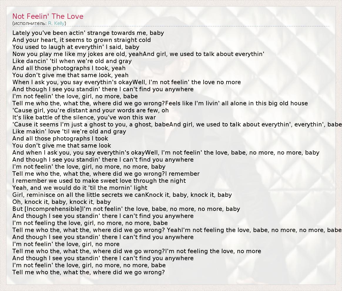 Lately you've been actin' strange towards me, baby And your heart, it seems to grown straight cold You used to laugh at everythin' I said, baby Now you play me like my jokes are old, yeahAnd girl, we used to talk about everythin' Like dancin' 'til when we're old and gray And all those photographs I took, yeah You don't give me that same look, yeah When I ask you, you say everythin's okayWell, I'm not feelin' the love no more And though I see you standin' there I can't find you anywhere I'm not feelin' the love, girl, no more, babe Tell me who the, what the, where did we go wrong?Feels like I'm livin' all alone in this big old house 'Cause girl, you're distant and your words are few, oh It's like battle of the silence, you've won this war 'Cause it seems I'm just a ghost to you, a ghost, babeAnd girl, we used to talk about everythin', everythin', babe Like makin' love 'til we're old and gray And all those photographs I took You don't give me that same look And when I ask you, you say everythin's okayWell, I'm not feelin' the love, babe, no more, no more, baby And though I see you standin' there I can't find you anywhere I'm not feelin' the love, girl, no more, no more, baby Tell me who the, what the, where did we go wrong?I remember I remember we used to make sweet love through the night Yeah, and we would do it 'til the mornin' light Girl, reminisce on all the little secrets we canKnock it, baby, knock it, baby Oh, knock it, baby, knock it, baby But [Incomprehensible]I'm not feelin' the love, babe, no more, no more, baby And though I see you standin' there I can't find you anywhere I'm not feeling the love, girl, no more, no more, babe Tell me who the, what the, where did we go wrong? YeahI'm not feeling the love, babe, no more, no more, babe And though I see you standin' there I can't find you anywhere I'm not feelin' the love, girl, no more Tell me who the, what the, where did we go wrong?I'm not feeling the love, no more And though I see you standin' there I can't find you anywhere I'm not feelin' the love, girl, no more, no more, babe Tell me who the, what the, where did we go wrong?