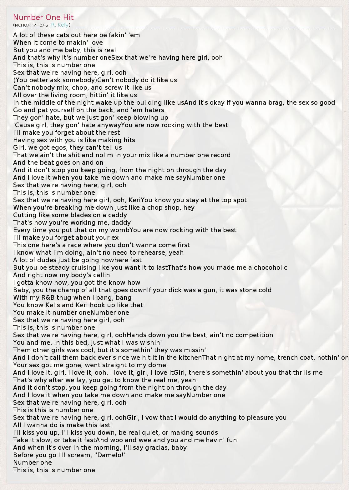 A lot of these cats out here be fakin' 'em When it come to makin' love But you and me baby, this is real And that's why it's number oneSex that we're having here girl, ooh This is, this is number one Sex that we're having here, girl, ooh (You better ask somebody)Can't nobody do it like us Can't nobody mix, chop, and screw it like us All over the living room, hittin' it like us In the middle of the night wake up the building like usAnd it's okay if you wanna brag, the sex so good Go and pat yourself on the back, and 'em haters They gon' hate, but we just gon' keep blowing up 'Cause girl, they gon' hate anywayYou are now rocking with the best I'll make you forget about the rest Having sex with you is like making hits Girl, we got egos, they can't tell us That we ain't the shit and noI'm in your mix like a number one record And the beat goes on and on And it don't stop you keep going, from the night on through the day And I love it when you take me down and make me sayNumber one Sex that we're having here, girl, ooh This is, this is number one Sex that we're having here girl, ooh, KeriYou know you stay at the top spot When you're breaking me down just like a chop shop, hey Cutting like some blades on a caddy That's how you're working me, daddy Every time you put that on my wombYou are now rocking with the best I'll make you forget about your ex This one here's a race where you don't wanna come first I know what I'm doing, ain't no need to rehearse, yeah A lot of dudes just be going nowhere fast But you be steady cruising like you want it to lastThat's how you made me a chocoholic And right now my body's callin' I gotta know how, you got the know how Baby, you the champ of all that goes downIf your dick was a gun, it was stone cold With my R&B thug when I bang, bang You know Kells and Keri hook up like that You make it number oneNumber one Sex that we're having here girl, ooh This is, this is number one Sex that we're having here, girl, oohHands down you the best, ain't no competition You and me, in this bed, just what I was wishin' Them other girls was cool, but it's somethin' they was missin' And I don't call them back ever since we hit it in the kitchenThat night at my home, trench coat, nothin' on Your sex got me gone, went straight to my dome And I love it, girl, I love it, ooh, I love it, girl, I love itGirl, there's somethin' about you that thrills me That's why after we lay, you get to know the real me, yeah And it don't stop, you keep going from the night on through the day And I love it when you take me down and make me sayNumber one Sex that we're having here, girl, ooh This is this is number one Sex that we're having here, girl, oohGirl, I vow that I would do anything to pleasure you All I wanna do is make this last I'll kiss you up, I'll kiss you down, be real quiet, or making sounds Take it slow, or take it fastAnd woo and wee and you and me havin' fun And when it's over in the morning, I'll say gracias, baby Before you go I'll scream, "Damelo!" Number one This is, this is number one