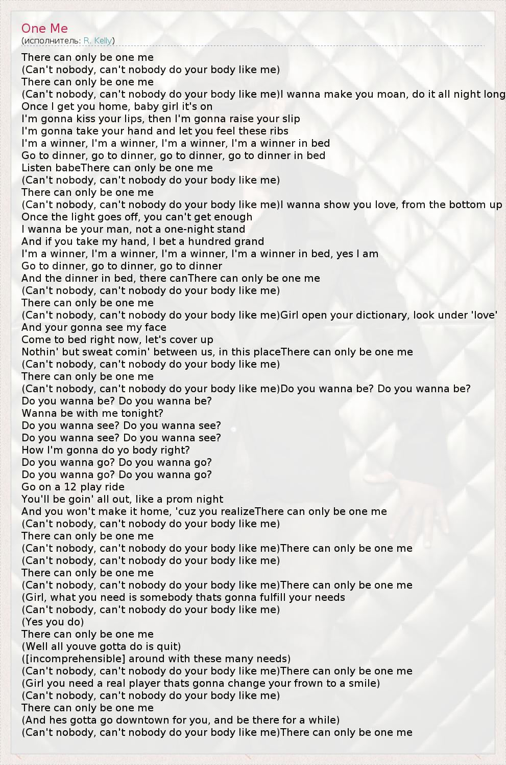 There can only be one me (Can't nobody, can't nobody do your body like me) There can only be one me (Can't nobody, can't nobody do your body like me)I wanna make you moan, do it all night long Once I get you home, baby girl it's on I'm gonna kiss your lips, then I'm gonna raise your slip I'm gonna take your hand and let you feel these ribs I'm a winner, I'm a winner, I'm a winner, I'm a winner in bed Go to dinner, go to dinner, go to dinner, go to dinner in bed Listen babeThere can only be one me (Can't nobody, can't nobody do your body like me) There can only be one me (Can't nobody, can't nobody do your body like me)I wanna show you love, from the bottom up Once the light goes off, you can't get enough I wanna be your man, not a one-night stand And if you take my hand, I bet a hundred grand I'm a winner, I'm a winner, I'm a winner, I'm a winner in bed, yes I am Go to dinner, go to dinner, go to dinner And the dinner in bed, there canThere can only be one me (Can't nobody, can't nobody do your body like me) There can only be one me (Can't nobody, can't nobody do your body like me)Girl open your dictionary, look under 'love' And your gonna see my face Come to bed right now, let's cover up Nothin' but sweat comin' between us, in this placeThere can only be one me (Can't nobody, can't nobody do your body like me) There can only be one me (Can't nobody, can't nobody do your body like me)Do you wanna be? Do you wanna be? Do you wanna be? Do you wanna be? Wanna be with me tonight? Do you wanna see? Do you wanna see? Do you wanna see? Do you wanna see? How I'm gonna do yo body right? Do you wanna go? Do you wanna go? Do you wanna go? Do you wanna go? Go on a 12 play ride You'll be goin' all out, like a prom night And you won't make it home, 'cuz you realizeThere can only be one me (Can't nobody, can't nobody do your body like me) There can only be one me (Can't nobody, can't nobody do your body like me)There can only be one me (Can't nobody, can't nobody do your body like me) There can only be one me (Can't nobody, can't nobody do your body like me)There can only be one me (Girl, what you need is somebody thats gonna fulfill your needs (Can't nobody, can't nobody do your body like me) (Yes you do) There can only be one me (Well all youve gotta do is quit) ([incomprehensible] around with these many needs) (Can't nobody, can't nobody do your body like me)There can only be one me (Girl you need a real player thats gonna change your frown to a smile) (Can't nobody, can't nobody do your body like me) There can only be one me (And hes gotta go downtown for you, and be there for a while) (Can't nobody, can't nobody do your body like me)There can only be one me