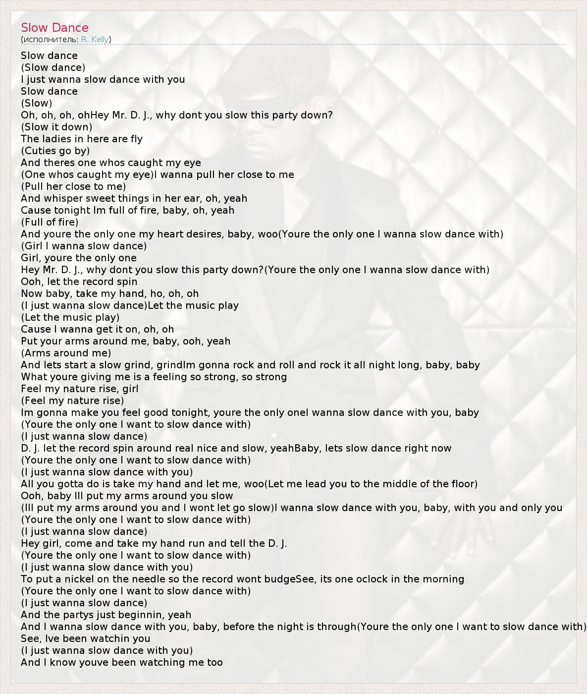 Slow dance (Slow dance) I just wanna slow dance with you Slow dance (Slow) Oh, oh, oh, ohHey Mr. D. J., why dont you slow this party down? (Slow it down) The ladies in here are fly (Cuties go by) And theres one whos caught my eye (One whos caught my eye)I wanna pull her close to me (Pull her close to me) And whisper sweet things in her ear, oh, yeah Cause tonight Im full of fire, baby, oh, yeah (Full of fire) And youre the only one my heart desires, baby, woo(Youre the only one I wanna slow dance with) (Girl I wanna slow dance) Girl, youre the only one Hey Mr. D. J., why dont you slow this party down?(Youre the only one I wanna slow dance with) Ooh, let the record spin Now baby, take my hand, ho, oh, oh (I just wanna slow dance)Let the music play (Let the music play) Cause I wanna get it on, oh, oh Put your arms around me, baby, ooh, yeah (Arms around me) And lets start a slow grind, grindIm gonna rock and roll and rock it all night long, baby, baby What youre giving me is a feeling so strong, so strong Feel my nature rise, girl (Feel my nature rise) Im gonna make you feel good tonight, youre the only oneI wanna slow dance with you, baby (Youre the only one I want to slow dance with) (I just wanna slow dance) D. J. let the record spin around real nice and slow, yeahBaby, lets slow dance right now (Youre the only one I want to slow dance with) (I just wanna slow dance with you) All you gotta do is take my hand and let me, woo(Let me lead you to the middle of the floor) Ooh, baby Ill put my arms around you slow (Ill put my arms around you and I wont let go slow)I wanna slow dance with you, baby, with you and only you (Youre the only one I want to slow dance with) (I just wanna slow dance) Hey girl, come and take my hand run and tell the D. J. (Youre the only one I want to slow dance with) (I just wanna slow dance with you) To put a nickel on the needle so the record wont budgeSee, its one oclock in the morning (Youre the only one I want to slow dance with) (I just wanna slow dance) And the partys just beginnin, yeah And I wanna slow dance with you, baby, before the night is through(Youre the only one I want to slow dance with) See, Ive been watchin you (I just wanna slow dance with you) And I know youve been watching me too