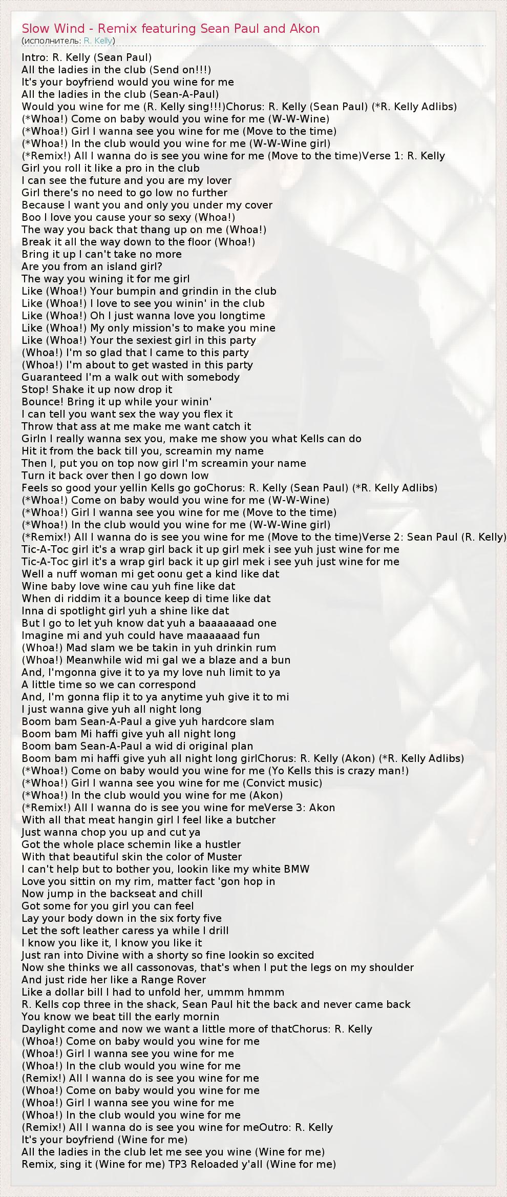 Intro: R. Kelly (Sean Paul) All the ladies in the club (Send on!!!) It's your boyfriend would you wine for me All the ladies in the club (Sean-A-Paul) Would you wine for me (R. Kelly sing!!!)Chorus: R. Kelly (Sean Paul) (*R. Kelly Adlibs) (*Whoa!) Come on baby would you wine for me (W-W-Wine) (*Whoa!) Girl I wanna see you wine for me (Move to the time) (*Whoa!) In the club would you wine for me (W-W-Wine girl) (*Remix!) All I wanna do is see you wine for me (Move to the time)Verse 1: R. Kelly Girl you roll it like a pro in the club I can see the future and you are my lover Girl there's no need to go low no further Because I want you and only you under my cover Boo I love you cause your so sexy (Whoa!) The way you back that thang up on me (Whoa!) Break it all the way down to the floor (Whoa!) Bring it up I can't take no more Are you from an island girl? The way you wining it for me girl Like (Whoa!) Your bumpin and grindin in the club Like (Whoa!) I love to see you winin' in the club Like (Whoa!) Oh I just wanna love you longtime Like (Whoa!) My only mission's to make you mine Like (Whoa!) Your the sexiest girl in this party (Whoa!) I'm so glad that I came to this party (Whoa!) I'm about to get wasted in this party Guaranteed I'm a walk out with somebody Stop! Shake it up now drop it Bounce! Bring it up while your winin' I can tell you want sex the way you flex it Throw that ass at me make me want catch it Girln I really wanna sex you, make me show you what Kells can do Hit it from the back till you, screamin my name Then I, put you on top now girl I'm screamin your name Turn it back over then I go down low Feels so good your yellin Kells go goChorus: R. Kelly (Sean Paul) (*R. Kelly Adlibs) (*Whoa!) Come on baby would you wine for me (W-W-Wine) (*Whoa!) Girl I wanna see you wine for me (Move to the time) (*Whoa!) In the club would you wine for me (W-W-Wine girl) (*Remix!) All I wanna do is see you wine for me (Move to the time)Verse 2: Sean Paul (R. Kelly) Tic-A-Toc girl it's a wrap girl back it up girl mek i see yuh just wine for me Tic-A-Toc girl it's a wrap girl back it up girl mek i see yuh just wine for me Well a nuff woman mi get oonu get a kind like dat Wine baby love wine cau yuh fine like dat When di riddim it a bounce keep di time like dat Inna di spotlight girl yuh a shine like dat But I go to let yuh know dat yuh a baaaaaaad one Imagine mi and yuh could have maaaaaad fun (Whoa!) Mad slam we be takin in yuh drinkin rum (Whoa!) Meanwhile wid mi gal we a blaze and a bun And, I'mgonna give it to ya my love nuh limit to ya A little time so we can correspond And, I'm gonna flip it to ya anytime yuh give it to mi I just wanna give yuh all night long Boom bam Sean-A-Paul a give yuh hardcore slam Boom bam Mi haffi give yuh all night long Boom bam Sean-A-Paul a wid di original plan Boom bam mi haffi give yuh all night long girlChorus: R. Kelly (Akon) (*R. Kelly Adlibs) (*Whoa!) Come on baby would you wine for me (Yo Kells this is crazy man!) (*Whoa!) Girl I wanna see you wine for me (Convict music) (*Whoa!) In the club would you wine for me (Akon) (*Remix!) All I wanna do is see you wine for meVerse 3: Akon With all that meat hangin girl I feel like a butcher Just wanna chop you up and cut ya Got the whole place schemin like a hustler With that beautiful skin the color of Muster I can't help but to bother you, lookin like my white BMW Love you sittin on my rim, matter fact 'gon hop in Now jump in the backseat and chill Got some for you girl you can feel Lay your body down in the six forty five Let the soft leather caress ya while I drill I know you like it, I know you like it Just ran into Divine with a shorty so fine lookin so excited Now she thinks we all cassonovas, that's when I put the legs on my shoulder And just ride her like a Range Rover Like a dollar bill I had to unfold her, ummm hmmm R. Kells cop three in the shack, Sean Paul hit the back and never came back You know we beat till the early mornin Daylight come and now we want a little more of thatChorus: R. Kelly (Whoa!) Come on baby would you wine for me (Whoa!) Girl I wanna see you wine for me (Whoa!) In the club would you wine for me (Remix!) All I wanna do is see you wine for me (Whoa!) Come on baby would you wine for me (Whoa!) Girl I wanna see you wine for me (Whoa!) In the club would you wine for me (Remix!) All I wanna do is see you wine for meOutro: R. Kelly It's your boyfriend (Wine for me) All the ladies in the club let me see you wine (Wine for me) Remix, sing it (Wine for me) TP3 Reloaded y'all (Wine for me)