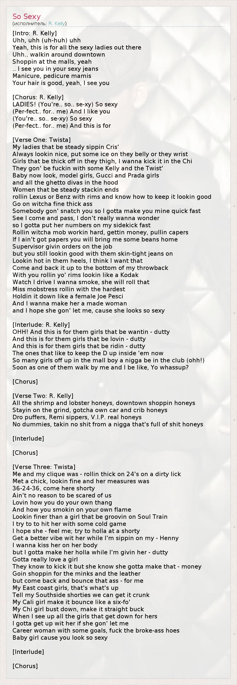 [Intro: R. Kelly] Uhh, uhh (uh-huh) uhh Yeah, this is for all the sexy ladies out there Uhh.. walkin around downtown Shoppin at the malls, yeah .. I see you in your sexy jeans Manicure, pedicure mamis Your hair is good, yeah, I see you [Chorus: R. Kelly] LADIES! (You're.. so.. se-xy) So sexy (Per-fect.. for.. me) And I like you (You're.. so.. se-xy) So sexy (Per-fect.. for.. me) And this is for [Verse One: Twista] My ladies that be steady sippin Cris' Always lookin nice, put some ice on they belly or they wrist Girls that be thick off in they thigh, I wanna kick it in the Chi They gon' be fuckin with some Kelly and the Twist' Baby now look, model girls, Gucci and Prada girls and all the ghetto divas in the hood Women that be steady stackin ends rollin Lexus or Benz with rims and know how to keep it lookin good Go on witcha fine thick ass Somebody gon' snatch you so I gotta make you mine quick fast See I come and pass, I don't really wanna wonder so I gotta put her numbers on my sidekick fast Rollin witcha mob workin hard, gettin money, pullin capers If I ain't got papers you will bring me some beans home Supervisor givin orders on the job but you still lookin good with them skin-tight jeans on Lookin hot in them heels, I think I want that Come and back it up to the bottom of my throwback With you rollin yo' rims lookin like a Kodak Watch I drive I wanna smoke, she will roll that Miss mobstress rollin with the hardest Holdin it down like a female Joe Pesci And I wanna make her a made woman and I hope she gon' let me, cause she looks so sexy [Interlude: R. Kelly] OHH! And this is for them girls that be wantin - dutty And this is for them girls that be lovin - dutty And this is for them girls that be ridin - dutty The ones that like to keep the D up inside 'em now So many girls off up in the mall boy a nigga be in the club (ohh!) Soon as one of them walk by me and I be like, Yo whassup? [Chorus] [Verse Two: R. Kelly] All the shrimp and lobster honeys, downtown shoppin honeys Stayin on the grind, gotcha own car and crib honeys Dro puffers, Remi sippers, V.I.P. real honeys No dummies, takin no shit from a nigga that's full of shit honeys [Interlude] [Chorus] [Verse Three: Twista] Me and my clique was - rollin thick on 24's on a dirty lick Met a chick, lookin fine and her measures was 36-24-36, come here shorty Ain't no reason to be scared of us Lovin how you do your own thang And how you smokin on your own flame Lookin finer than a girl that be groovin on Soul Train I try to to hit her with some cold game I hope she - feel me; try to holla at a shorty Get a better vibe wit her while I'm sippin on my - Henny I wanna kiss her on her body but I gotta make her holla while I'm givin her - dutty Gotta really love a girl They know to kick it but she know she gotta make that - money Goin shoppin for the minks and the leather but come back and bounce that ass - for me My East coast girls, that's what's up Tell my Southside shorties we can get it crunk My Cali girl make it bounce like a six-fo' My Chi girl bust down, make it straight buck When I see up all the girls that get down for hers I gotta get up wit her if she gon' let me Career woman with some goals, fuck the broke-ass hoes Baby girl cause you look so sexy [Interlude] [Chorus]