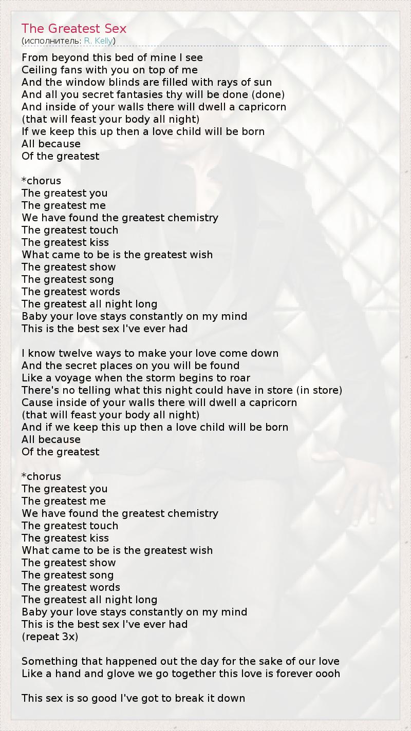 From beyond this bed of mine I see Ceiling fans with you on top of me And the window blinds are filled with rays of sun And all you secret fantasies thy will be done (done) And inside of your walls there will dwell a capricorn (that will feast your body all night) If we keep this up then a love child will be born All because Of the greatest *chorus The greatest you The greatest me We have found the greatest chemistry The greatest touch The greatest kiss What came to be is the greatest wish The greatest show The greatest song The greatest words The greatest all night long Baby your love stays constantly on my mind This is the best sex I've ever had I know twelve ways to make your love come down And the secret places on you will be found Like a voyage when the storm begins to roar There's no telling what this night could have in store (in store) Cause inside of your walls there will dwell a capricorn (that will feast your body all night) And if we keep this up then a love child will be born All because Of the greatest *chorus The greatest you The greatest me We have found the greatest chemistry The greatest touch The greatest kiss What came to be is the greatest wish The greatest show The greatest song The greatest words The greatest all night long Baby your love stays constantly on my mind This is the best sex I've ever had (repeat 3x) Something that happened out the day for the sake of our love Like a hand and glove we go together this love is forever oooh This sex is so good I've got to break it down