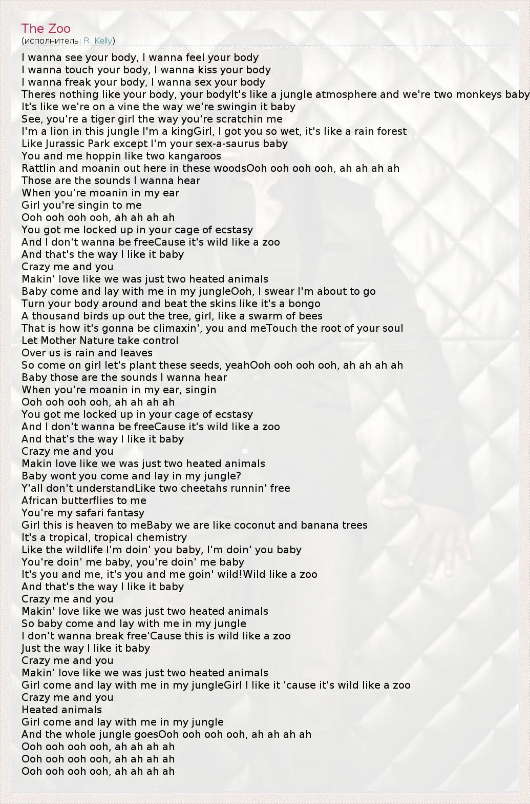 I wanna see your body, I wanna feel your body I wanna touch your body, I wanna kiss your body I wanna freak your body, I wanna sex your body Theres nothing like your body, your bodyIt's like a jungle atmosphere and we're two monkeys baby It's like we're on a vine the way we're swingin it baby See, you're a tiger girl the way you're scratchin me I'm a lion in this jungle I'm a kingGirl, I got you so wet, it's like a rain forest Like Jurassic Park except I'm your sex-a-saurus baby You and me hoppin like two kangaroos Rattlin and moanin out here in these woodsOoh ooh ooh ooh, ah ah ah ah Those are the sounds I wanna hear When you're moanin in my ear Girl you're singin to me Ooh ooh ooh ooh, ah ah ah ah You got me locked up in your cage of ecstasy And I don't wanna be freeCause it's wild like a zoo And that's the way I like it baby Crazy me and you Makin' love like we was just two heated animals Baby come and lay with me in my jungleOoh, I swear I'm about to go Turn your body around and beat the skins like it's a bongo A thousand birds up out the tree, girl, like a swarm of bees That is how it's gonna be climaxin', you and meTouch the root of your soul Let Mother Nature take control Over us is rain and leaves So come on girl let's plant these seeds, yeahOoh ooh ooh ooh, ah ah ah ah Baby those are the sounds I wanna hear When you're moanin in my ear, singin Ooh ooh ooh ooh, ah ah ah ah You got me locked up in your cage of ecstasy And I don't wanna be freeCause it's wild like a zoo And that's the way I like it baby Crazy me and you Makin love like we was just two heated animals Baby wont you come and lay in my jungle? Y'all don't understandLike two cheetahs runnin' free African butterflies to me You're my safari fantasy Girl this is heaven to meBaby we are like coconut and banana trees It's a tropical, tropical chemistry Like the wildlife I'm doin' you baby, I'm doin' you baby You're doin' me baby, you're doin' me baby It's you and me, it's you and me goin' wild!Wild like a zoo And that's the way I like it baby Crazy me and you Makin' love like we was just two heated animals So baby come and lay with me in my jungle I don't wanna break free'Cause this is wild like a zoo Just the way I like it baby Crazy me and you Makin' love like we was just two heated animals Girl come and lay with me in my jungleGirl I like it 'cause it's wild like a zoo Crazy me and you Heated animals Girl come and lay with me in my jungle And the whole jungle goesOoh ooh ooh ooh, ah ah ah ah Ooh ooh ooh ooh, ah ah ah ah Ooh ooh ooh ooh, ah ah ah ah Ooh ooh ooh ooh, ah ah ah ah