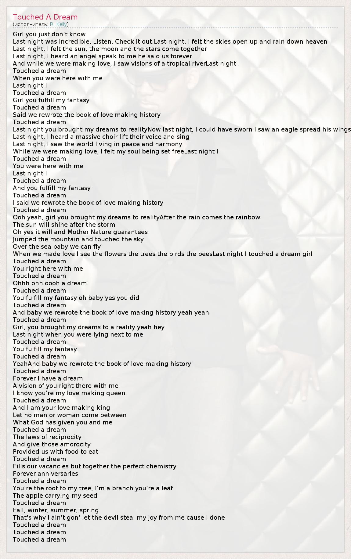Girl you just don't know Last night was incredible. Listen. Check it out.Last night, I felt the skies open up and rain down heaven Last night, I felt the sun, the moon and the stars come together Last night, I heard an angel speak to me he said us forever And while we were making love, I saw visions of a tropical riverLast night I Touched a dream When you were here with me Last night I Touched a dream Girl you fulfill my fantasy Touched a dream Said we rewrote the book of love making history Touched a dream Last night you brought my dreams to realityNow last night, I could have sworn I saw an eagle spread his wings Last night, I heard a massive choir lift their voice and sing Last night, I saw the world living in peace and harmony While we were making love, I felt my soul being set freeLast night I Touched a dream You were here with me Last night I Touched a dream And you fulfill my fantasy Touched a dream I said we rewrote the book of love making history Touched a dream Ooh yeah, girl you brought my dreams to realityAfter the rain comes the rainbow The sun will shine after the storm Oh yes it will and Mother Nature guarantees Jumped the mountain and touched the sky Over the sea baby we can fly When we made love I see the flowers the trees the birds the beesLast night I touched a dream girl Touched a dream You right here with me Touched a dream Ohhh ohh oooh a dream Touched a dream You fulfill my fantasy oh baby yes you did Touched a dream And baby we rewrote the book of love making history yeah yeah Touched a dream Girl, you brought my dreams to a reality yeah hey Last night when you were lying next to me Touched a dream You fulfill my fantasy Touched a dream YeahAnd baby we rewrote the book of love making history Touched a dream Forever I have a dream A vision of you right there with me I know you're my love making queen Touched a dream And I am your love making king Let no man or woman come between What God has given you and me Touched a dream The laws of reciprocity And give those amorocity Provided us with food to eat Touched a dream Fills our vacancies but together the perfect chemistry Forever anniversaries Touched a dream You're the root to my tree, I'm a branch you're a leaf The apple carrying my seed Touched a dream Fall, winter, summer, spring That's why I ain't gon' let the devil steal my joy from me cause I done Touched a dream Touched a dream Touched a dream