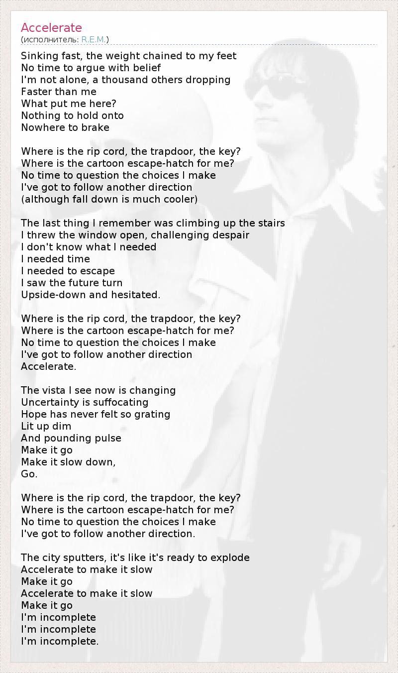 Это интересно:Свой первый концерт «R.E.M.» отыграли в американском городишке Атенс, штат Джорджия, 19 апреля 1980 года. В состав группы входили четверо выгнанных из университета парней: Майкл Стайп (р. 4 января 1960, Декатер, США; вокал), Питер Бак (р. 6 декабря 1956, Беркли, США; гитара), Майк Миллс (р. 17 декабря 1958, Оранж Каунти, США; бас) и Билл Берри (р. 31 июля 1958, Далат, США; ударные). Приобретя неплохую популярность... продолжение