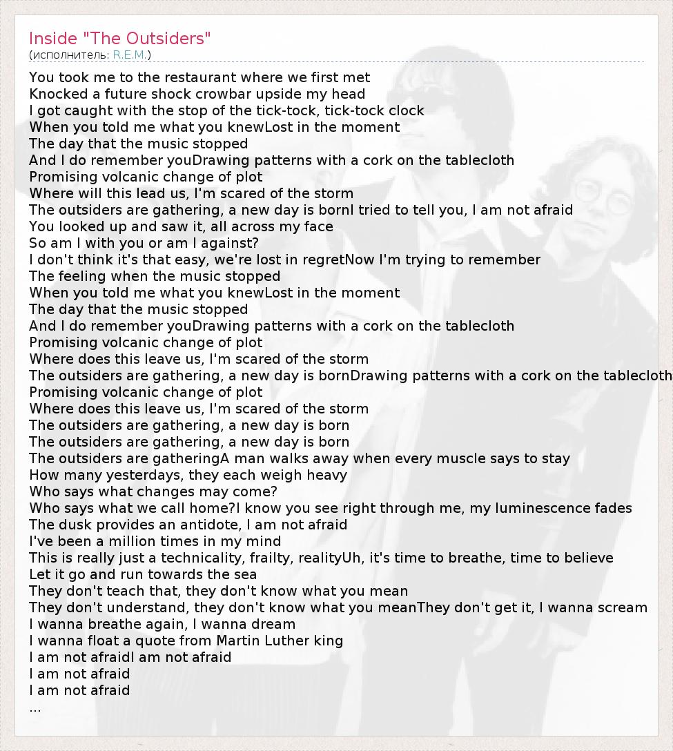You took me to the restaurant where we first met Knocked a future shock crowbar upside my head I got caught with the stop of the tick-tock, tick-tock clock When you told me what you knewLost in the moment The day that the music stopped And I do remember youDrawing patterns with a cork on the tablecloth Promising volcanic change of plot Where will this lead us, I'm scared of the storm The outsiders are gathering, a new day is bornI tried to tell you, I am not afraid You looked up and saw it, all across my face So am I with you or am I against? I don't think it's that easy, we're lost in regretNow I'm trying to remember The feeling when the music stopped When you told me what you knewLost in the moment The day that the music stopped And I do remember youDrawing patterns with a cork on the tablecloth Promising volcanic change of plot Where does this leave us, I'm scared of the storm The outsiders are gathering, a new day is bornDrawing patterns with a cork on the tablecloth Promising volcanic change of plot Where does this leave us, I'm scared of the storm The outsiders are gathering, a new day is born The outsiders are gathering, a new day is born The outsiders are gatheringA man walks away when every muscle says to stay How many yesterdays, they each weigh heavy Who says what changes may come? Who says what we call home?I know you see right through me, my luminescence fades The dusk provides an antidote, I am not afraid I've been a million times in my mind This is really just a technicality, frailty, realityUh, it's time to breathe, time to believe Let it go and run towards the sea They don't teach that, they don't know what you mean They don't understand, they don't know what you meanThey don't get it, I wanna scream I wanna breathe again, I wanna dream I wanna float a quote from Martin Luther king I am not afraidI am not afraid I am not afraid I am not afraid ...