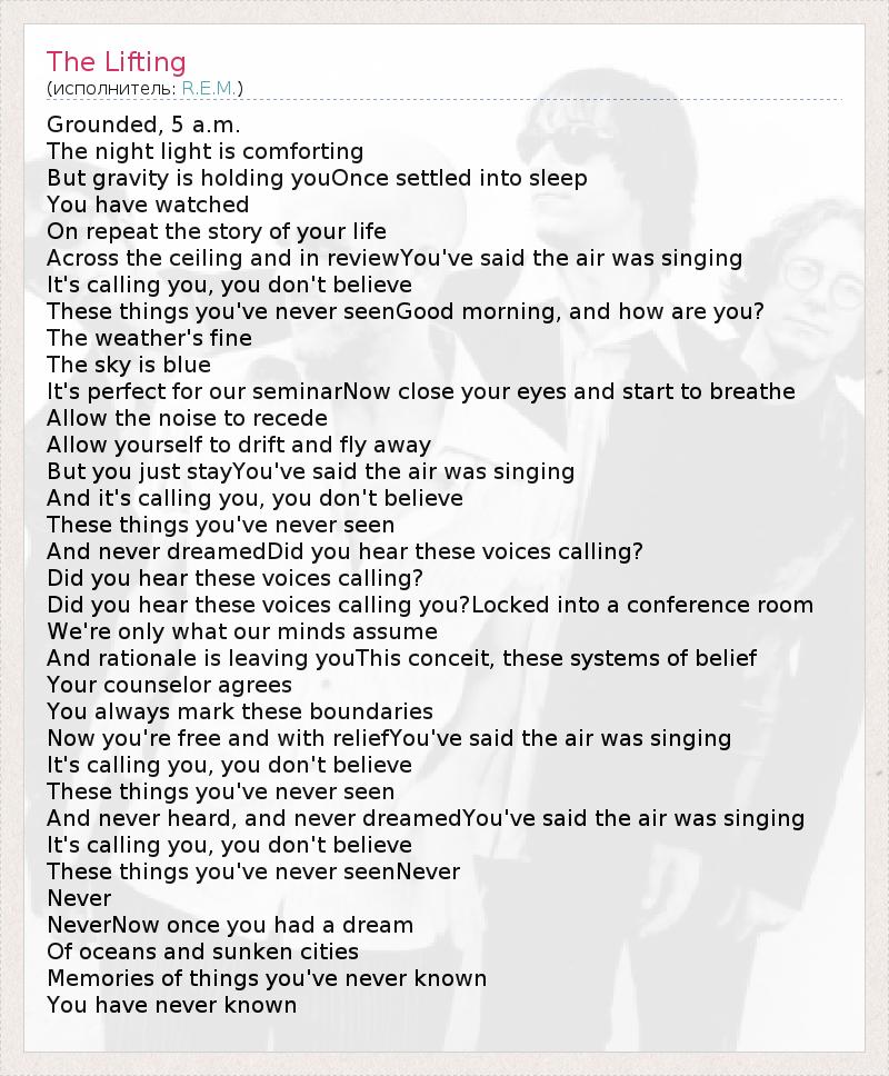 Это интересно:Свой первый концерт «R.E.M.» отыграли в американском городишке Атенс, штат Джорджия, 19 апреля 1980 года. В состав группы входили четверо выгнанных из университета парней: Майкл Стайп (р. 4 января 1960, Декатер, США; вокал), Питер Бак (р. 6 декабря 1956, Беркли, США; гитара), Майк Миллс (р. 17 декабря 1958, Оранж Каунти, США; бас) и Билл Берри (р. 31 июля 1958, Далат, США; ударные). Приобретя неплохую популярность... продолжение