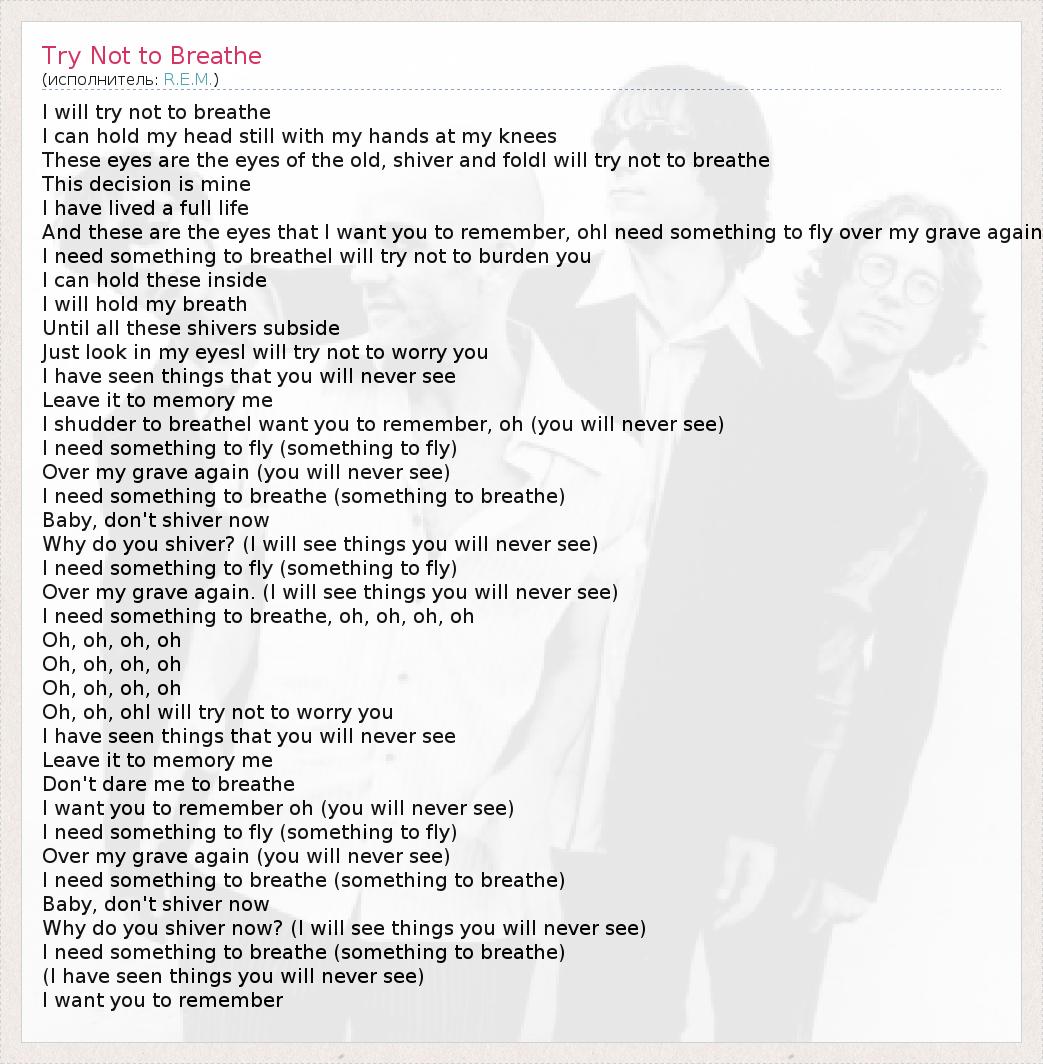 I will try not to breathe I can hold my head still with my hands at my knees These eyes are the eyes of the old, shiver and foldI will try not to breathe This decision is mine I have lived a full life And these are the eyes that I want you to remember, ohI need something to fly over my grave again I need something to breatheI will try not to burden you I can hold these inside I will hold my breath Until all these shivers subside Just look in my eyesI will try not to worry you I have seen things that you will never see Leave it to memory me I shudder to breatheI want you to remember, oh (you will never see) I need something to fly (something to fly) Over my grave again (you will never see) I need something to breathe (something to breathe) Baby, don't shiver now Why do you shiver? (I will see things you will never see) I need something to fly (something to fly) Over my grave again. (I will see things you will never see) I need something to breathe, oh, oh, oh, oh Oh, oh, oh, oh Oh, oh, oh, oh Oh, oh, oh, oh Oh, oh, ohI will try not to worry you I have seen things that you will never see Leave it to memory me Don't dare me to breathe I want you to remember oh (you will never see) I need something to fly (something to fly) Over my grave again (you will never see) I need something to breathe (something to breathe) Baby, don't shiver now Why do you shiver now? (I will see things you will never see) I need something to breathe (something to breathe) (I have seen things you will never see) I want you to remember