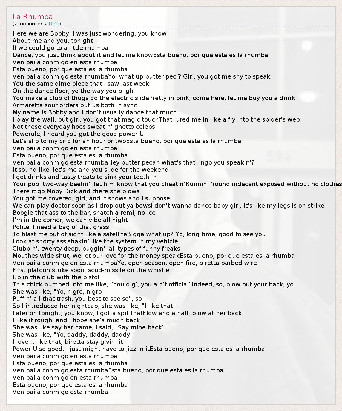 Ven baila conmigo esta rhumbaHey butter pecan what's that lingo you speakin'?