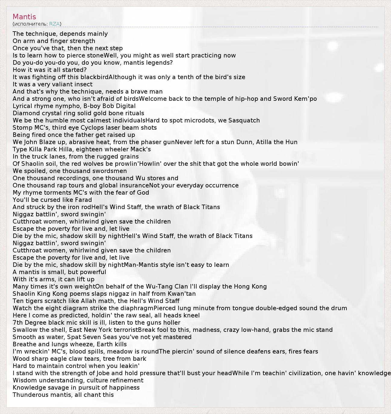Это интересно:RZA (в русской транскрипции Риза) — искусный создатель магически простых и завораживающих ритмов, абсурдных сэмплерных коллажей, оставляющих слушателя в недоумении, что это — эксперименты новичка или насмешка гения, лет десять считается одним из самых оригинальных хип-хоп продюсеров.Музыкант и бизнесмен, стоявший у истоков двух великих рэп-команд, давший толчок десятку успешных... продолжение