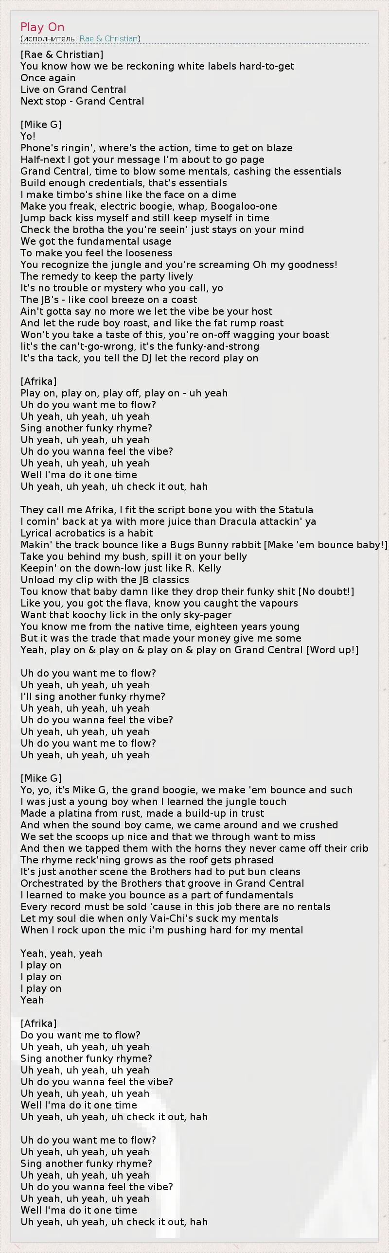 [Rae & Christian] You know how we be reckoning white labels hard-to-get Once again Live on Grand Central Next stop - Grand Central [Mike G] Yo! Phone's ringin', where's the action, time to get on blaze Half-next I got your message I'm about to go page Grand Central, time to blow some mentals, cashing the essentials Build enough credentials, that's essentials I make timbo's shine like the face on a dime Make you freak, electric boogie, whap, Boogaloo-one Jump back kiss myself and still keep myself in time Check the brotha the you're seein' just stays on your mind We got the fundamental usage To make you feel the looseness You recognize the jungle and you're screaming Oh my goodness! The remedy to keep the party lively It's no trouble or mystery who you call, yo The JB's - like cool breeze on a coast Ain't gotta say no more we let the vibe be your host And let the rude boy roast, and like the fat rump roast Won't you take a taste of this, you're on-off wagging your boast Iit's the can't-go-wrong, it's the funky-and-strong It's tha tack, you tell the DJ let the record play on [Afrika] Play on, play on, play off, play on - uh yeah Uh do you want me to flow? Uh yeah, uh yeah, uh yeah Sing another funky rhyme? Uh yeah, uh yeah, uh yeah Uh do you wanna feel the vibe? Uh yeah, uh yeah, uh yeah Well I'ma do it one time Uh yeah, uh yeah, uh check it out, hah They call me Afrika, I fit the script bone you with the Statula I comin' back at ya with more juice than Dracula attackin' ya Lyrical acrobatics is a habit Makin' the track bounce like a Bugs Bunny rabbit [Make 'em bounce baby!] Take you behind my bush, spill it on your belly Keepin' on the down-low just like R. Kelly Unload my clip with the JB classics Tou know that baby damn like they drop their funky shit [No doubt!] Like you, you got the flava, know you caught the vapours Want that koochy lick in the only sky-pager You know me from the native time, eighteen years young But it was the trade that made your money give me some Yeah, play on & play on & play on & play on Grand Central [Word up!] Uh do you want me to flow? Uh yeah, uh yeah, uh yeah I'll sing another funky rhyme? Uh yeah, uh yeah, uh yeah Uh do you wanna feel the vibe? Uh yeah, uh yeah, uh yeah Uh do you want me to flow? Uh yeah, uh yeah, uh yeah [Mike G] Yo, yo, it's Mike G, the grand boogie, we make 'em bounce and such I was just a young boy when I learned the jungle touch Made a platina from rust, made a build-up in trust And when the sound boy came, we came around and we crushed We set the scoops up nice and that we through want to miss And then we tapped them with the horns they never came off their crib The rhyme reck'ning grows as the roof gets phrased It's just another scene the Brothers had to put bun cleans Orchestrated by the Brothers that groove in Grand Central I learned to make you bounce as a part of fundamentals Every record must be sold 'cause in this job there are no rentals Let my soul die when only Vai-Chi's suck my mentals When I rock upon the mic i'm pushing hard for my mental Yeah, yeah, yeah I play on I play on I play on Yeah [Afrika] Do you want me to flow? Uh yeah, uh yeah, uh yeah Sing another funky rhyme? Uh yeah, uh yeah, uh yeah Uh do you wanna feel the vibe? Uh yeah, uh yeah, uh yeah Well I'ma do it one time Uh yeah, uh yeah, uh check it out, hah Uh do you want me to flow? Uh yeah, uh yeah, uh yeah Sing another funky rhyme? Uh yeah, uh yeah, uh yeah Uh do you wanna feel the vibe? Uh yeah, uh yeah, uh yeah Well I'ma do it one time Uh yeah, uh yeah, uh check it out, hah