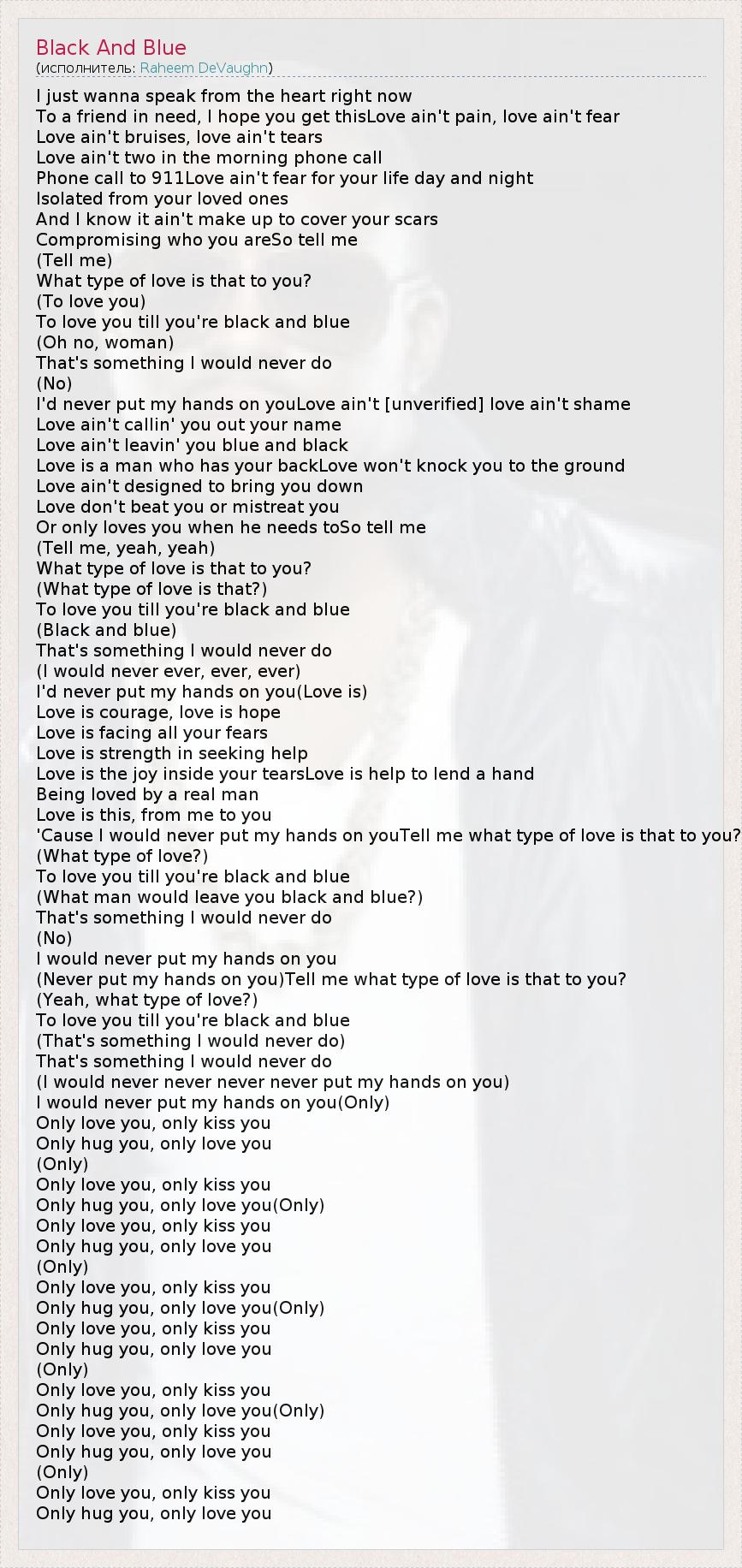 I just wanna speak from the heart right now To a friend in need, I hope you get thisLove ain't pain, love ain't fear Love ain't bruises, love ain't tears Love ain't two in the morning phone call Phone call to 911Love ain't fear for your life day and night Isolated from your loved ones And I know it ain't make up to cover your scars Compromising who you areSo tell me (Tell me) What type of love is that to you? (To love you) To love you till you're black and blue (Oh no, woman) That's something I would never do (No) I'd never put my hands on youLove ain't [unverified] love ain't shame Love ain't callin' you out your name Love ain't leavin' you blue and black Love is a man who has your backLove won't knock you to the ground Love ain't designed to bring you down Love don't beat you or mistreat you Or only loves you when he needs toSo tell me (Tell me, yeah, yeah) What type of love is that to you? (What type of love is that?) To love you till you're black and blue (Black and blue) That's something I would never do (I would never ever, ever, ever) I'd never put my hands on you(Love is) Love is courage, love is hope Love is facing all your fears Love is strength in seeking help Love is the joy inside your tearsLove is help to lend a hand Being loved by a real man Love is this, from me to you 'Cause I would never put my hands on youTell me what type of love is that to you? (What type of love?) To love you till you're black and blue (What man would leave you black and blue?) That's something I would never do (No) I would never put my hands on you (Never put my hands on you)Tell me what type of love is that to you? (Yeah, what type of love?) To love you till you're black and blue (That's something I would never do) That's something I would never do (I would never never never never put my hands on you) I would never put my hands on you(Only) Only love you, only kiss you Only hug you, only love you (Only) Only love you, only kiss you Only hug you, only love you(Only) Only love you, only kiss you Only hug you, only love you (Only) Only love you, only kiss you Only hug you, only love you(Only) Only love you, only kiss you Only hug you, only love you (Only) Only love you, only kiss you Only hug you, only love you(Only) Only love you, only kiss you Only hug you, only love you (Only) Only love you, only kiss you Only hug you, only love you