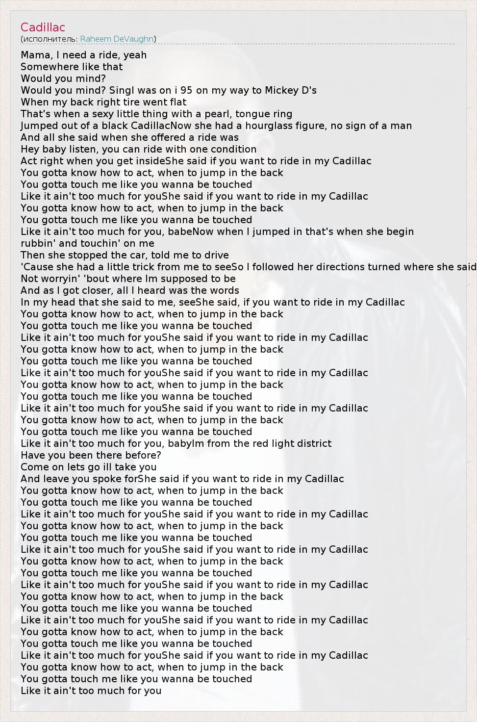 Mama, I need a ride, yeah Somewhere like that Would you mind? Would you mind? SingI was on i 95 on my way to Mickey D's When my back right tire went flat That's when a sexy little thing with a pearl, tongue ring Jumped out of a black CadillacNow she had a hourglass figure, no sign of a man And all she said when she offered a ride was Hey baby listen, you can ride with one condition Act right when you get insideShe said if you want to ride in my Cadillac You gotta know how to act, when to jump in the back You gotta touch me like you wanna be touched Like it ain't too much for youShe said if you want to ride in my Cadillac You gotta know how to act, when to jump in the back You gotta touch me like you wanna be touched Like it ain't too much for you, babeNow when I jumped in that's when she begin rubbin' and touchin' on me Then she stopped the car, told me to drive 'Cause she had a little trick from me to seeSo I followed her directions turned where she said Not worryin' 'bout where Im supposed to be And as I got closer, all I heard was the words In my head that she said to me, seeShe said, if you want to ride in my Cadillac You gotta know how to act, when to jump in the back You gotta touch me like you wanna be touched Like it ain't too much for youShe said if you want to ride in my Cadillac You gotta know how to act, when to jump in the back You gotta touch me like you wanna be touched Like it ain't too much for youShe said if you want to ride in my Cadillac You gotta know how to act, when to jump in the back You gotta touch me like you wanna be touched Like it ain't too much for youShe said if you want to ride in my Cadillac You gotta know how to act, when to jump in the back You gotta touch me like you wanna be touched Like it ain't too much for you, babyIm from the red light district Have you been there before? Come on lets go ill take you And leave you spoke forShe said if you want to ride in my Cadillac You gotta know how to act, when to jump in the back You gotta touch me like you wanna be touched Like it ain't too much for youShe said if you want to ride in my Cadillac You gotta know how to act, when to jump in the back You gotta touch me like you wanna be touched Like it ain't too much for youShe said if you want to ride in my Cadillac You gotta know how to act, when to jump in the back You gotta touch me like you wanna be touched Like it ain't too much for youShe said if you want to ride in my Cadillac You gotta know how to act, when to jump in the back You gotta touch me like you wanna be touched Like it ain't too much for youShe said if you want to ride in my Cadillac You gotta know how to act, when to jump in the back You gotta touch me like you wanna be touched Like it ain't too much for youShe said if you want to ride in my Cadillac You gotta know how to act, when to jump in the back You gotta touch me like you wanna be touched Like it ain't too much for you
