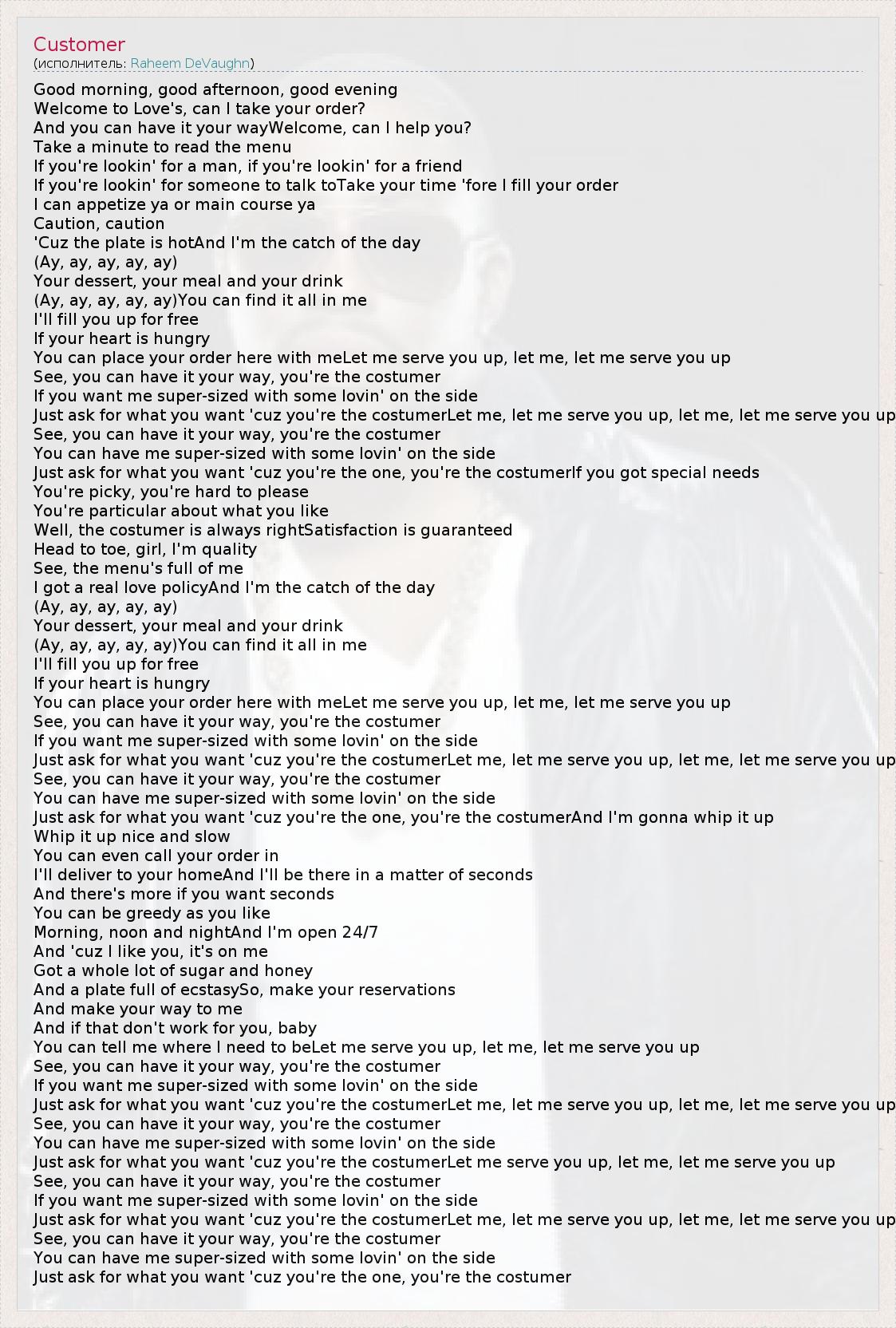 Good morning, good afternoon, good evening Welcome to Love's, can I take your order? And you can have it your wayWelcome, can I help you? Take a minute to read the menu If you're lookin' for a man, if you're lookin' for a friend If you're lookin' for someone to talk toTake your time 'fore I fill your order I can appetize ya or main course ya Caution, caution 'Cuz the plate is hotAnd I'm the catch of the day (Ay, ay, ay, ay, ay) Your dessert, your meal and your drink (Ay, ay, ay, ay, ay)You can find it all in me I'll fill you up for free If your heart is hungry You can place your order here with meLet me serve you up, let me, let me serve you up See, you can have it your way, you're the costumer If you want me super-sized with some lovin' on the side Just ask for what you want 'cuz you're the costumerLet me, let me serve you up, let me, let me serve you up See, you can have it your way, you're the costumer You can have me super-sized with some lovin' on the side Just ask for what you want 'cuz you're the one, you're the costumerIf you got special needs You're picky, you're hard to please You're particular about what you like Well, the costumer is always rightSatisfaction is guaranteed Head to toe, girl, I'm quality See, the menu's full of me I got a real love policyAnd I'm the catch of the day (Ay, ay, ay, ay, ay) Your dessert, your meal and your drink (Ay, ay, ay, ay, ay)You can find it all in me I'll fill you up for free If your heart is hungry You can place your order here with meLet me serve you up, let me, let me serve you up See, you can have it your way, you're the costumer If you want me super-sized with some lovin' on the side Just ask for what you want 'cuz you're the costumerLet me, let me serve you up, let me, let me serve you up See, you can have it your way, you're the costumer You can have me super-sized with some lovin' on the side Just ask for what you want 'cuz you're the one, you're the costumerAnd I'm gonna whip it up Whip it up nice and slow You can even call your order in I'll deliver to your homeAnd I'll be there in a matter of seconds And there's more if you want seconds You can be greedy as you like Morning, noon and nightAnd I'm open 24/7 And 'cuz I like you, it's on me Got a whole lot of sugar and honey And a plate full of ecstasySo, make your reservations And make your way to me And if that don't work for you, baby You can tell me where I need to beLet me serve you up, let me, let me serve you up See, you can have it your way, you're the costumer If you want me super-sized with some lovin' on the side Just ask for what you want 'cuz you're the costumerLet me, let me serve you up, let me, let me serve you up See, you can have it your way, you're the costumer You can have me super-sized with some lovin' on the side Just ask for what you want 'cuz you're the costumerLet me serve you up, let me, let me serve you up See, you can have it your way, you're the costumer If you want me super-sized with some lovin' on the side Just ask for what you want 'cuz you're the costumerLet me, let me serve you up, let me, let me serve you up See, you can have it your way, you're the costumer You can have me super-sized with some lovin' on the side Just ask for what you want 'cuz you're the one, you're the costumer