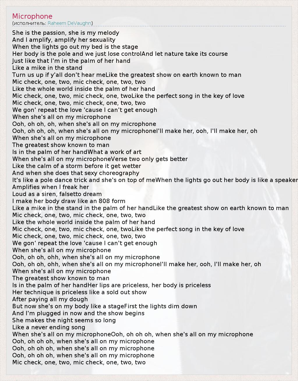 She is the passion, she is my melody And I amplify, amplify her sexuality When the lights go out my bed is the stage Her body is the pole and we just lose controlAnd let nature take its course Just like that I'm in the palm of her hand Like a mike in the stand Turn us up if y'all don't hear meLike the greatest show on earth known to man Mic check, one, two, mic check, one, two, two Like the whole world inside the palm of her hand Mic check, one, two, mic check, one, twoLike the perfect song in the key of love Mic check, one, two, mic check, one, two, two We gon' repeat the love 'cause I can't get enough When she's all on my microphone Ooh, oh oh, oh, when she's all on my microphone Ooh, oh oh, oh, when she's all on my microphoneI'll make her, ooh, I'll make her, oh When she's all on my microphone The greatest show known to man Is in the palm of her handWhat a work of art When she's all on my microphoneVerse two only gets better Like the calm of a storm before it get wetter And when she does that sexy choreography It's like a pole dance trick and she's on top of meWhen the lights go out her body is like a speaker Amplifies when I freak her Loud as a siren, falsetto dream I make her body draw like an 808 form Like a mike in the stand in the palm of her handLike the greatest show on earth known to man Mic check, one, two, mic check, one, two, two Like the whole world inside the palm of her hand Mic check, one, two, mic check, one, twoLike the perfect song in the key of love Mic check, one, two, mic check, one, two, two We gon' repeat the love 'cause I can't get enough When she's all on my microphone Ooh, oh oh, ohh, when she's all on my microphone Ooh, oh oh, ohh, when she's all on my microphoneI'll make her, ooh, I'll make her, oh When she's all on my microphone The greatest show known to man Is in the palm of her handHer lips are priceless, her body is priceless Her technique is priceless like a sold out show After paying all my dough But now she's on my body like a stageFirst the lights dim down And I'm plugged in now and the show begins She makes the night seems so long Like a never ending song When she's all on my microphoneOoh, oh oh oh, when she's all on my microphone Ooh, oh oh oh, when she's all on my microphone Ooh, oh oh oh, when she's all on my microphone Ooh, oh oh oh, when she's all on my microphone Mic check, one, two, mic check, one, two, two
