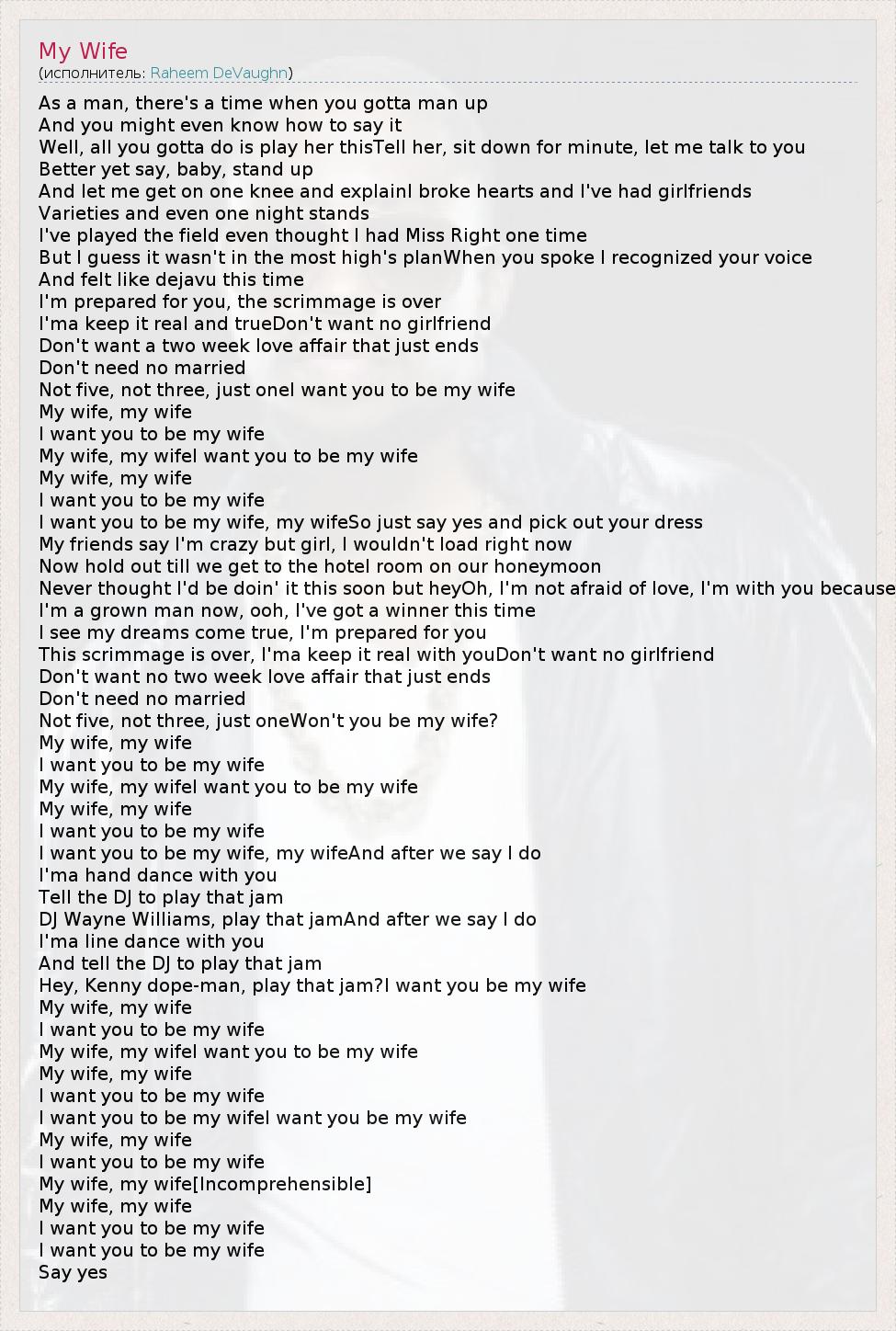 As a man, there's a time when you gotta man up And you might even know how to say it Well, all you gotta do is play her thisTell her, sit down for minute, let me talk to you Better yet say, baby, stand up And let me get on one knee and explainI broke hearts and I've had girlfriends Varieties and even one night stands I've played the field even thought I had Miss Right one time But I guess it wasn't in the most high's planWhen you spoke I recognized your voice And felt like dejavu this time I'm prepared for you, the scrimmage is over I'ma keep it real and trueDon't want no girlfriend Don't want a two week love affair that just ends Don't need no married Not five, not three, just oneI want you to be my wife My wife, my wife I want you to be my wife My wife, my wifeI want you to be my wife My wife, my wife I want you to be my wife I want you to be my wife, my wifeSo just say yes and pick out your dress My friends say I'm crazy but girl, I wouldn't load right now Now hold out till we get to the hotel room on our honeymoon Never thought I'd be doin' it this soon but heyOh, I'm not afraid of love, I'm with you because I'm a grown man now, ooh, I've got a winner this time I see my dreams come true, I'm prepared for you This scrimmage is over, I'ma keep it real with youDon't want no girlfriend Don't want no two week love affair that just ends Don't need no married Not five, not three, just oneWon't you be my wife? My wife, my wife I want you to be my wife My wife, my wifeI want you to be my wife My wife, my wife I want you to be my wife I want you to be my wife, my wifeAnd after we say I do I'ma hand dance with you Tell the DJ to play that jam DJ Wayne Williams, play that jamAnd after we say I do I'ma line dance with you And tell the DJ to play that jam Hey, Kenny dope-man, play that jam?I want you be my wife My wife, my wife I want you to be my wife My wife, my wifeI want you to be my wife My wife, my wife I want you to be my wife I want you to be my wifeI want you be my wife My wife, my wife I want you to be my wife My wife, my wife[Incomprehensible] My wife, my wife I want you to be my wife I want you to be my wife Say yes