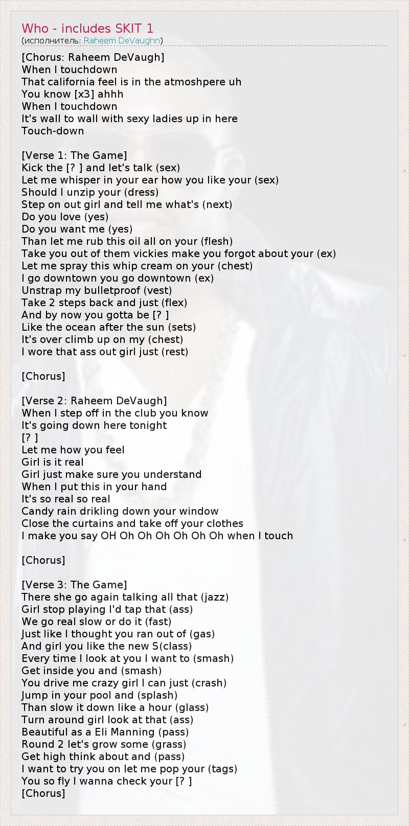 [Chorus: Raheem DeVaugh] When I touchdown That california feel is in the atmoshpere uh You know [x3] ahhh When I touchdown It's wall to wall with sexy ladies up in here Touch-down [Verse 1: The Game] Kick the [? ] and let's talk (sex) Let me whisper in your ear how you like your (sex) Should I unzip your (dress) Step on out girl and tell me what's (next) Do you love (yes) Do you want me (yes) Than let me rub this oil all on your (flesh) Take you out of them vickies make you forgot about your (ex) Let me spray this whip cream on your (chest) I go downtown you go downtown (ex) Unstrap my bulletproof (vest) Take 2 steps back and just (flex) And by now you gotta be [? ] Like the ocean after the sun (sets) It's over climb up on my (chest) I wore that ass out girl just (rest) [Chorus] [Verse 2: Raheem DeVaugh] When I step off in the club you know It's going down here tonight [? ] Let me how you feel Girl is it real Girl just make sure you understand When I put this in your hand It's so real so real Candy rain drikling down your window Close the curtains and take off your clothes I make you say OH Oh Oh Oh Oh Oh Oh when I touch [Chorus] [Verse 3: The Game] There she go again talking all that (jazz) Girl stop playing I'd tap that (ass) We go real slow or do it (fast) Just like I thought you ran out of (gas) And girl you like the new S(class) Every time I look at you I want to (smash) Get inside you and (smash) You drive me crazy girl I can just (crash) Jump in your pool and (splash) Than slow it down like a hour (glass) Turn around girl look at that (ass) Beautiful as a Eli Manning (pass) Round 2 let's grow some (grass) Get high think about and (pass) I want to try you on let me pop your (tags) You so fly I wanna check your [? ] [Chorus]