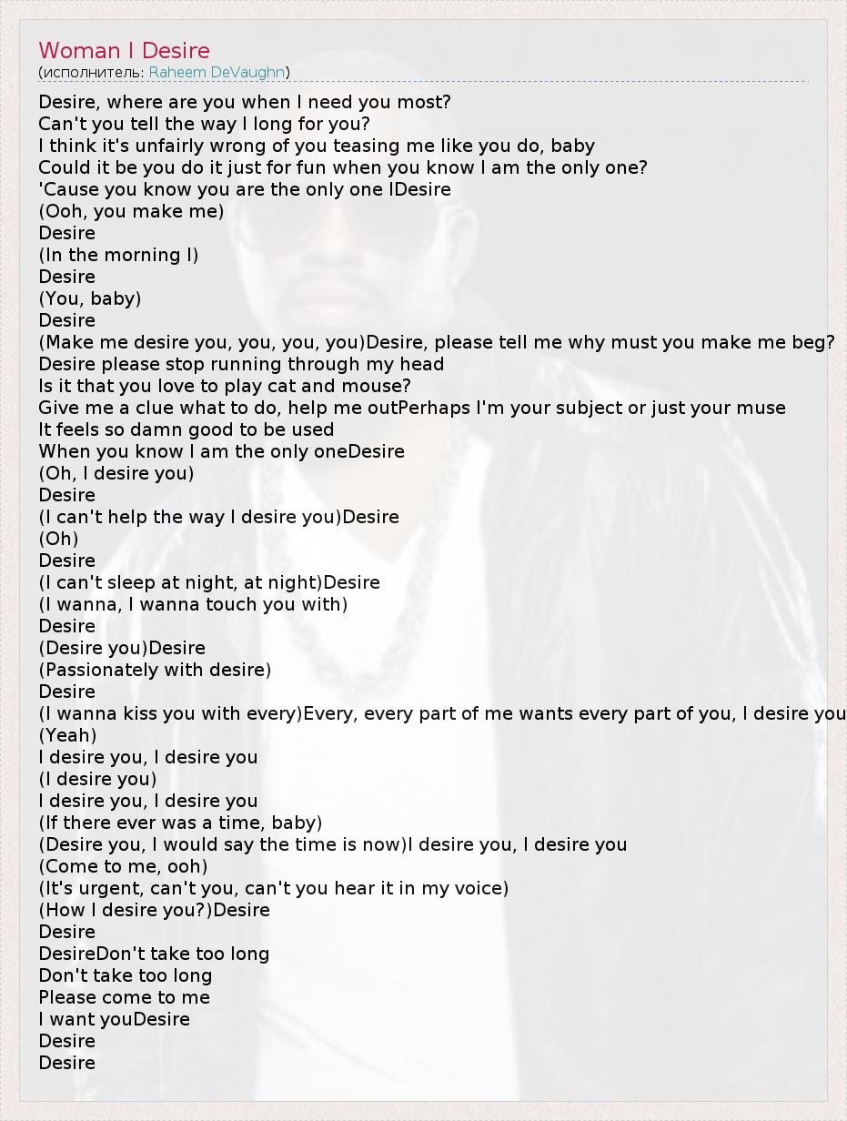 Desire, where are you when I need you most? Can't you tell the way I long for you? I think it's unfairly wrong of you teasing me like you do, baby Could it be you do it just for fun when you know I am the only one? 'Cause you know you are the only one IDesire (Ooh, you make me) Desire (In the morning I) Desire (You, baby) Desire (Make me desire you, you, you, you)Desire, please tell me why must you make me beg? Desire please stop running through my head Is it that you love to play cat and mouse? Give me a clue what to do, help me outPerhaps I'm your subject or just your muse It feels so damn good to be used When you know I am the only oneDesire (Oh, I desire you) Desire (I can't help the way I desire you)Desire (Oh) Desire (I can't sleep at night, at night)Desire (I wanna, I wanna touch you with) Desire (Desire you)Desire (Passionately with desire) Desire (I wanna kiss you with every)Every, every part of me wants every part of you, I desire you (Yeah) I desire you, I desire you (I desire you) I desire you, I desire you (If there ever was a time, baby) (Desire you, I would say the time is now)I desire you, I desire you (Come to me, ooh) (It's urgent, can't you, can't you hear it in my voice) (How I desire you?)Desire Desire DesireDon't take too long Don't take too long Please come to me I want youDesire Desire Desire