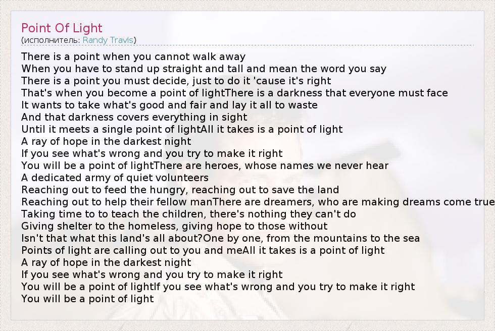 There is a point when you cannot walk away When you have to stand up straight and tall and mean the word you say There is a point you must decide, just to do it 'cause it's right That's when you become a point of lightThere is a darkness that everyone must face It wants to take what's good and fair and lay it all to waste And that darkness covers everything in sight Until it meets a single point of lightAll it takes is a point of light A ray of hope in the darkest night If you see what's wrong and you try to make it right You will be a point of lightThere are heroes, whose names we never hear A dedicated army of quiet volunteers Reaching out to feed the hungry, reaching out to save the land Reaching out to help their fellow manThere are dreamers, who are making dreams come true Taking time to to teach the children, there's nothing they can't do Giving shelter to the homeless, giving hope to those without Isn't that what this land's all about?One by one, from the mountains to the sea Points of light are calling out to you and meAll it takes is a point of light A ray of hope in the darkest night If you see what's wrong and you try to make it right You will be a point of lightIf you see what's wrong and you try to make it right You will be a point of light