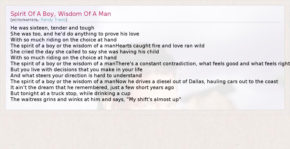 ГлавнаяИсполнителиRandy TravisSpirit Of A Boy, Wisdom Of A Man