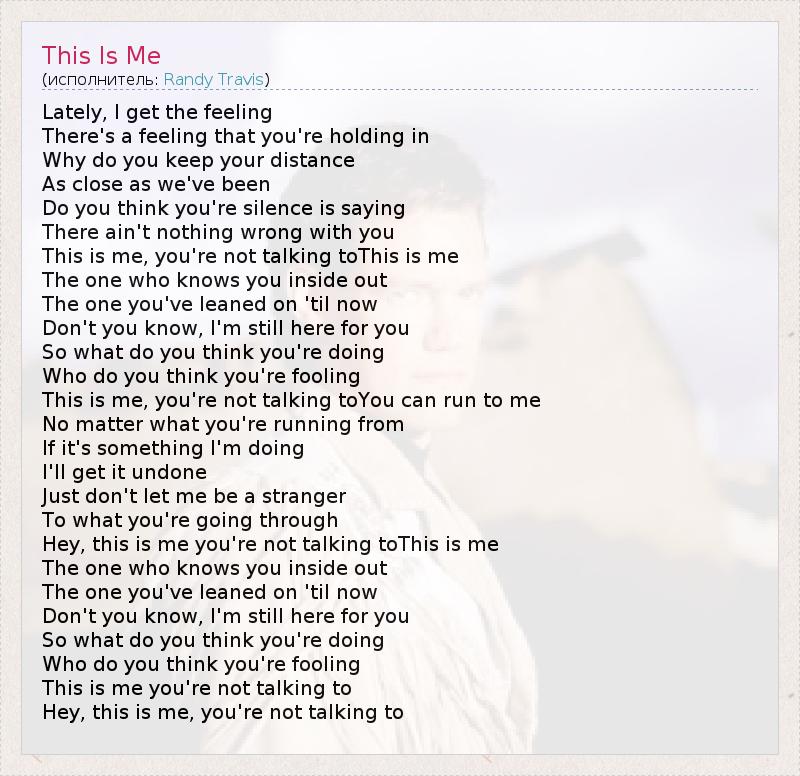 Lately, I get the feeling There's a feeling that you're holding in Why do you keep your distance As close as we've been Do you think you're silence is saying There ain't nothing wrong with you This is me, you're not talking toThis is me The one who knows you inside out The one you've leaned on 'til now Don't you know, I'm still here for you So what do you think you're doing Who do you think you're fooling This is me, you're not talking toYou can run to me No matter what you're running from If it's something I'm doing I'll get it undone Just don't let me be a stranger To what you're going through Hey, this is me you're not talking toThis is me The one who knows you inside out The one you've leaned on 'til now Don't you know, I'm still here for you So what do you think you're doing Who do you think you're fooling This is me you're not talking to Hey, this is me, you're not talking to
