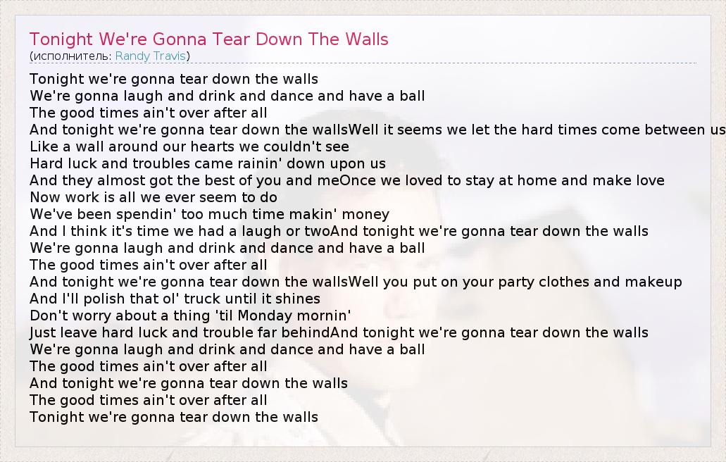 ГлавнаяИсполнителиRandy TravisTonight We're Gonna Tear Down The Walls