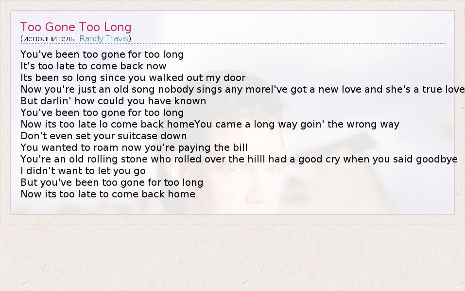 А как ты думаешь, о чем песня "Too Gone Too Long" ?