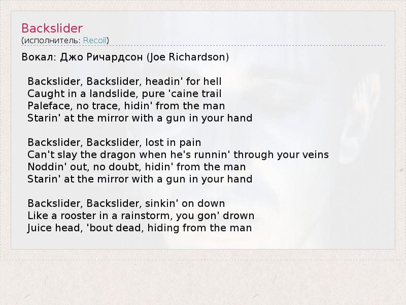 Вокал: Джо Ричардсон (Joe Richardson) Backslider, Backslider, headin' for hell Caught in a landslide, pure 'caine trail Paleface, no trace, hidin' from the man Starin' at the mirror with a gun in your hand Backslider, Backslider, lost in pain Can't slay the dragon when he's runnin' through your veins Noddin' out, no doubt, hidin' from the man Starin' at the mirror with a gun in your hand Backslider, Backslider, sinkin' on down Like a rooster in a rainstorm, you gon' drown Juice head, 'bout dead, hiding from the man