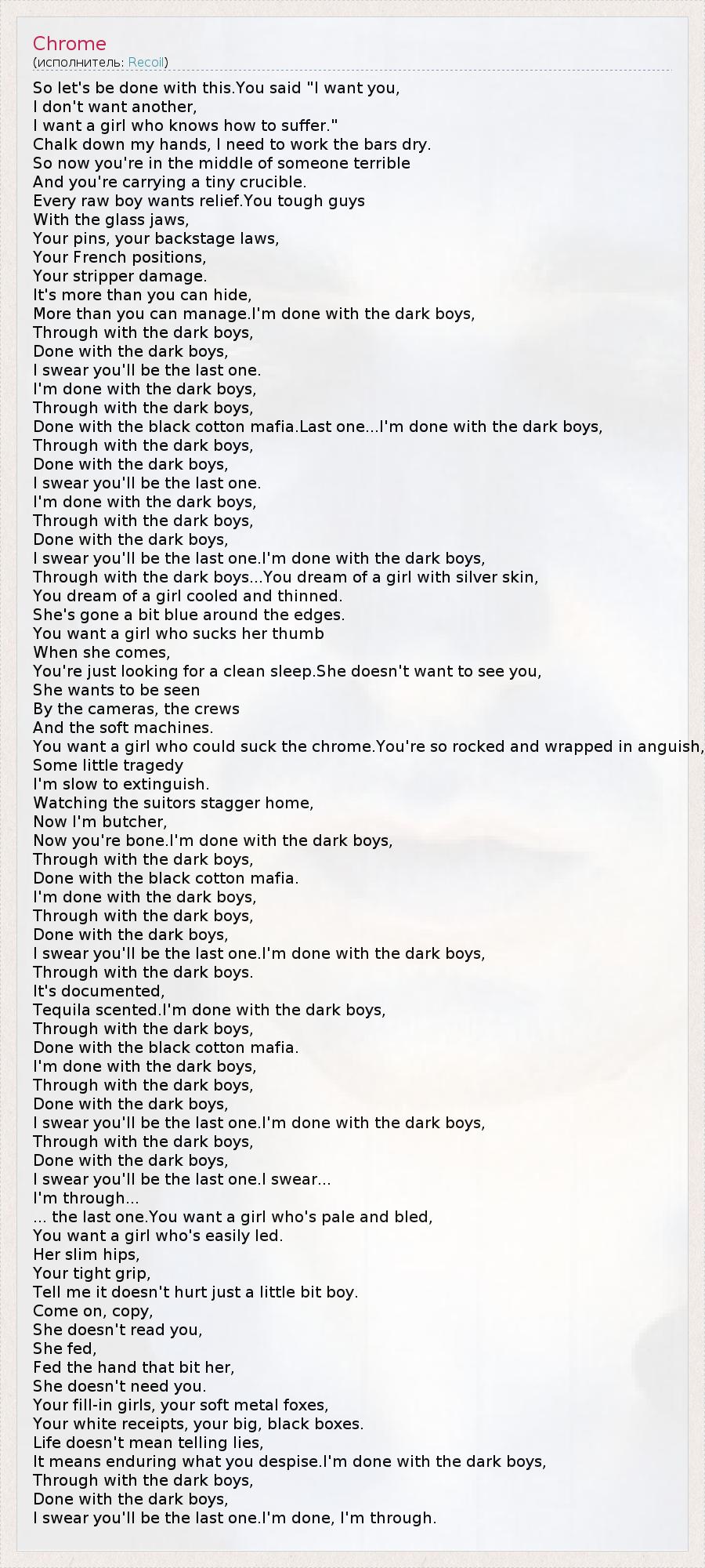 You want a girl who could suck the chrome.You're so rocked and wrapped in anguish,