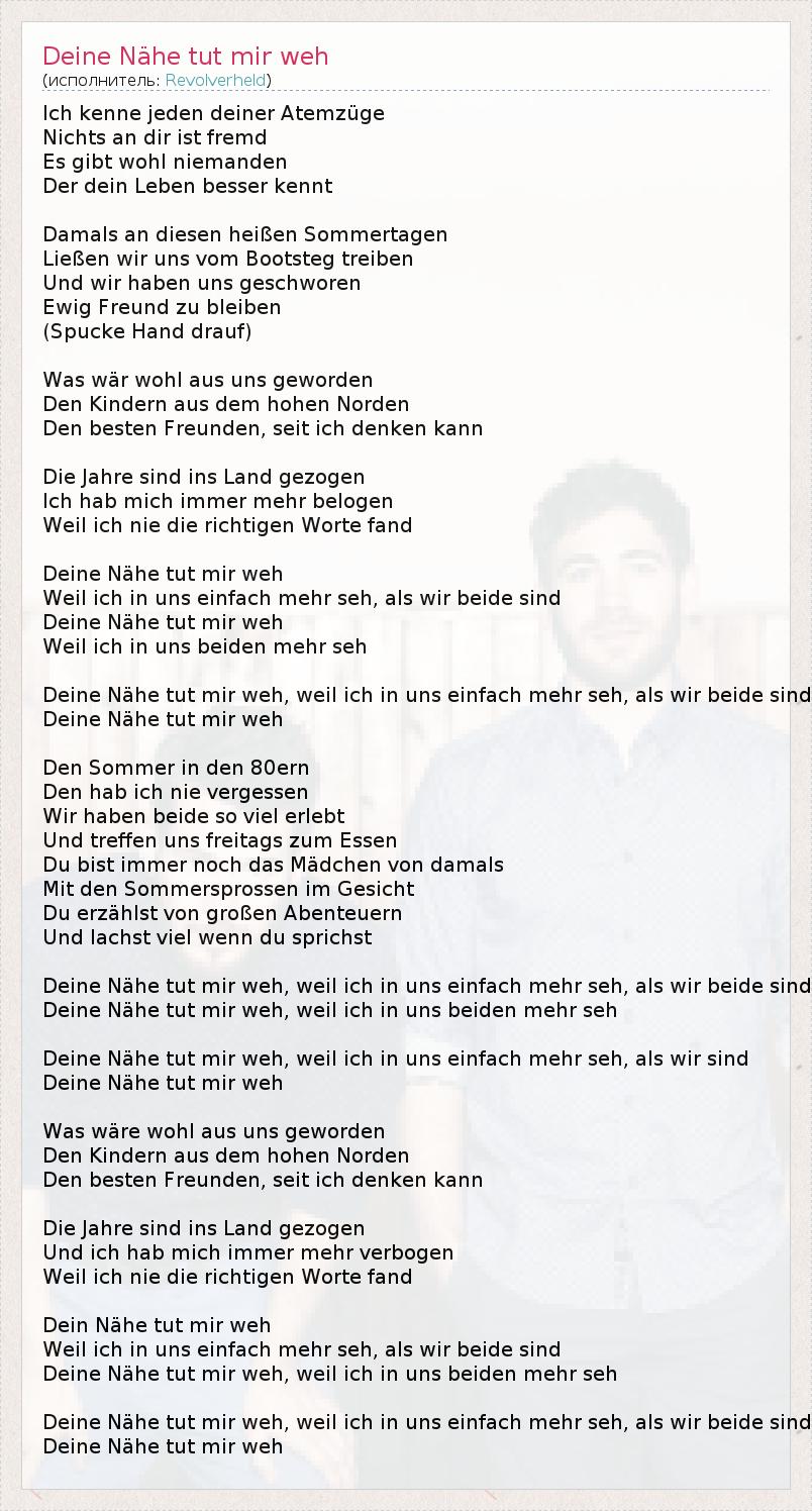 Ich kenne jeden deiner Atemzüge Nichts an dir ist fremd Es gibt wohl niemanden Der dein Leben besser kennt Damals an diesen heißen Sommertagen Ließen wir uns vom Bootsteg treiben Und wir haben uns geschworen Ewig Freund zu bleiben (Spucke Hand drauf) Was wär wohl aus uns geworden Den Kindern aus dem hohen Norden Den besten Freunden, seit ich denken kann Die Jahre sind ins Land gezogen Ich hab mich immer mehr belogen Weil ich nie die richtigen Worte fand Deine Nähe tut mir weh Weil ich in uns einfach mehr seh, als wir beide sind Deine Nähe tut mir weh Weil ich in uns beiden mehr seh Deine Nähe tut mir weh, weil ich in uns einfach mehr seh, als wir beide sind Deine Nähe tut mir weh Den Sommer in den 80ern Den hab ich nie vergessen Wir haben beide so viel erlebt Und treffen uns freitags zum Essen Du bist immer noch das Mädchen von damals Mit den Sommersprossen im Gesicht Du erzählst von großen Abenteuern Und lachst viel wenn du sprichst Deine Nähe tut mir weh, weil ich in uns einfach mehr seh, als wir beide sind Deine Nähe tut mir weh, weil ich in uns beiden mehr seh Deine Nähe tut mir weh, weil ich in uns einfach mehr seh, als wir sind Deine Nähe tut mir weh Was wäre wohl aus uns geworden Den Kindern aus dem hohen Norden Den besten Freunden, seit ich denken kann Die Jahre sind ins Land gezogen Und ich hab mich immer mehr verbogen Weil ich nie die richtigen Worte fand Dein Nähe tut mir weh Weil ich in uns einfach mehr seh, als wir beide sind Deine Nähe tut mir weh, weil ich in uns beiden mehr seh Deine Nähe tut mir weh, weil ich in uns einfach mehr seh, als wir beide sind Deine Nähe tut mir weh
