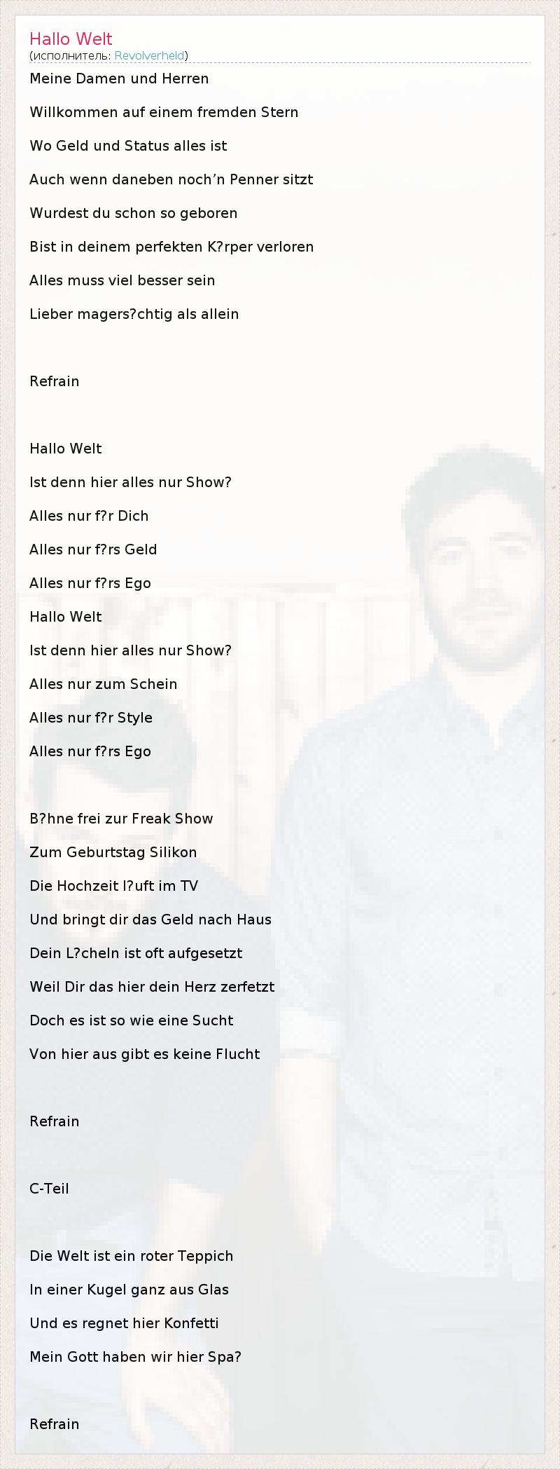 Это интересно:Revolverheld - немецкая рок-группа. Состав группы: Йоханнес Штрате (Вокал), Кристофер Хюнеке (гитара/бэк-вокал), Нильс Грёч (гитара/бэк-вокал), Якоб Зинн (ударные) и Флориан Шпейер (бас-гитара). Группа была основана в Гамбурге в 2003 году. Изначально группа носила название "Manga". Позже в 2004 году группа решила сменить название на "Revolverheld". В 2006 году группа приняла участие в музыкальном конкурсе... продолжение