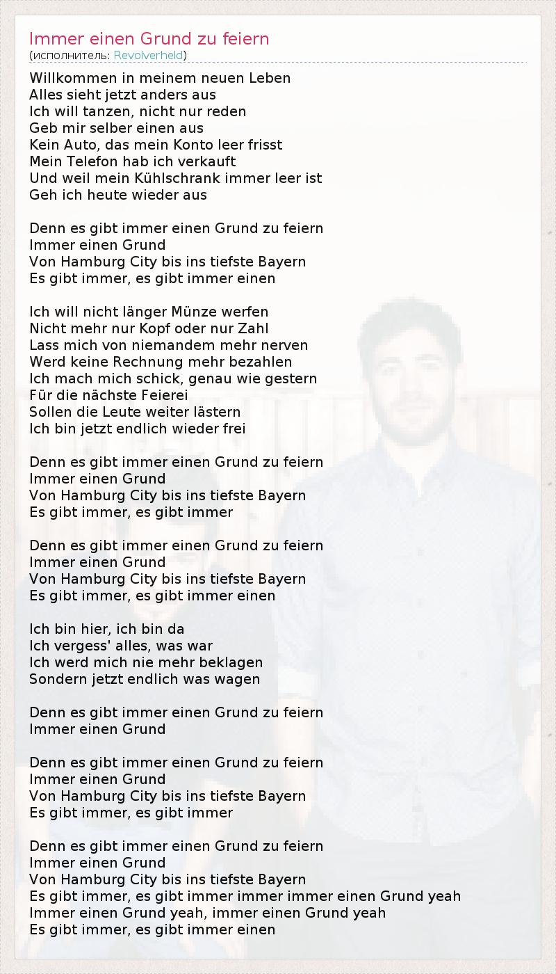 Всегда найдется повод для того, чтоб отпраздновать Добро пожаловать в мою новую жизнь. Теперь всё выглядит иначе. Хочу танцевать, а не просто говорить. Сам со всем покончил. Никакого авто, что съедает мой счет, Продал мой телефон и, Поскольку мой холодильник вечно пуст, Сегодня вновь из дому иду куда-то. Ведь всегда найдется повод для того, чтоб отпраздновать, Всегда найдется повод. От Гамбурга и до самой глубинки Баварии Всегда, всегда найдется хоть один. Не хочу больше бросать монетку, Не хочу больше выбирать между орлом и решкой, Не дам никому меня раздражать, Не буду больше платить по счетам. Я отправляюсь так же, как и завтра, На поиски какой-нибудь вечеринки. Люди снова будут клеветать, А я наконец-то свободен. Ведь всегда найдется повод для того, чтоб отпраздновать, Всегда найдется повод. От Гамбурга и до самой глубинки Баварии Всегда, всегда найдется хоть один. Ведь всегда найдется повод для того, чтоб отпраздновать, Всегда найдется повод. От Гамбурга и до самой глубинки Баварии Всегда, всегда найдется хоть один. Я здесь, я тут, Я забываю всё, что было, Я никогда не буду жаловаться, Вместо этого наконец-то решусь. Ведь всегда найдется повод для того, чтоб отпраздновать, Всегда найдется повод. Ведь всегда найдется повод для того, чтоб отпраздновать, Всегда найдется повод. От Гамбурга и до самой глубинки Баварии Всегда, всегда найдется хоть один. Ведь всегда найдется повод для того, чтоб отпраздновать, Всегда найдется повод. От Гамбурга и до самой глубинки Баварии Всегда, всегда найдется хоть один повод, эх, Всегда хоть один повод эх, всегда повод, эх... Найдется всегда, найдется всегда хоть один...