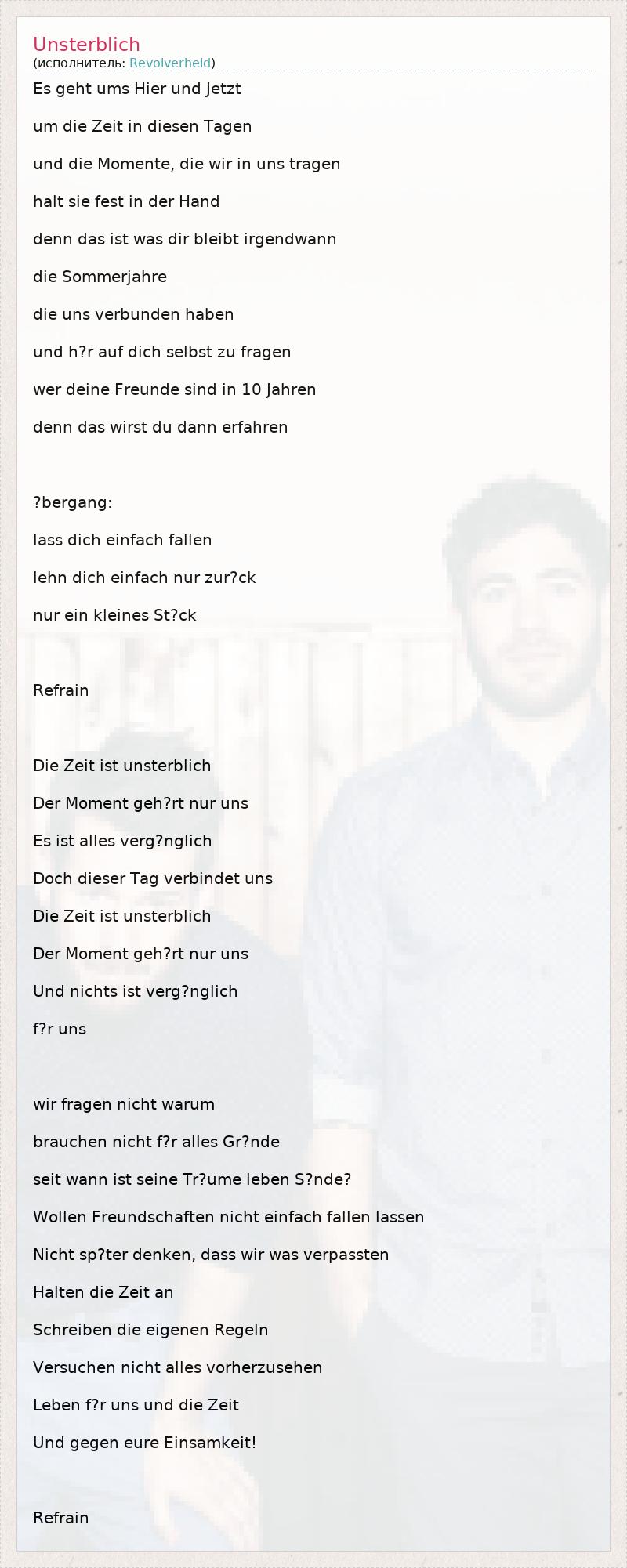 Это интересно:Revolverheld - немецкая рок-группа. Состав группы: Йоханнес Штрате (Вокал), Кристофер Хюнеке (гитара/бэк-вокал), Нильс Грёч (гитара/бэк-вокал), Якоб Зинн (ударные) и Флориан Шпейер (бас-гитара). Группа была основана в Гамбурге в 2003 году. Изначально группа носила название "Manga". Позже в 2004 году группа решила сменить название на "Revolverheld". В 2006 году группа приняла участие в музыкальном конкурсе... продолжение