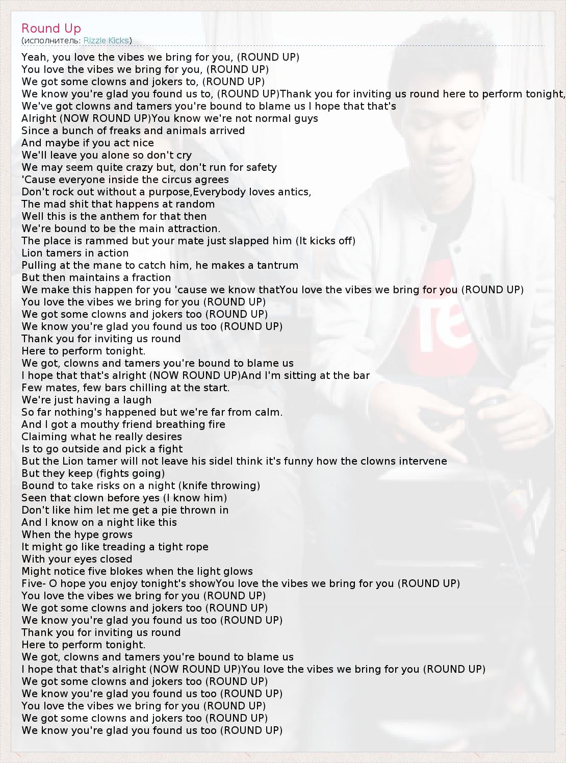 Это интересно:Rizzle Kicks — молодой хип хоп дуэт из Англии. Формально их группа появилась примерно в 1996 году, когда Джордан и Харли целыми днями играли на заднем дворе, будучи еще совсем детьми. Спустя 8 лет, после переезда в Брайтон, они снова встретились, а еще через 4 года — вместе закончили один колледж.Вскоре мальчики поняли насколько хорошо сочетаются их стили и официально стали называть себя Rizzle... продолжение