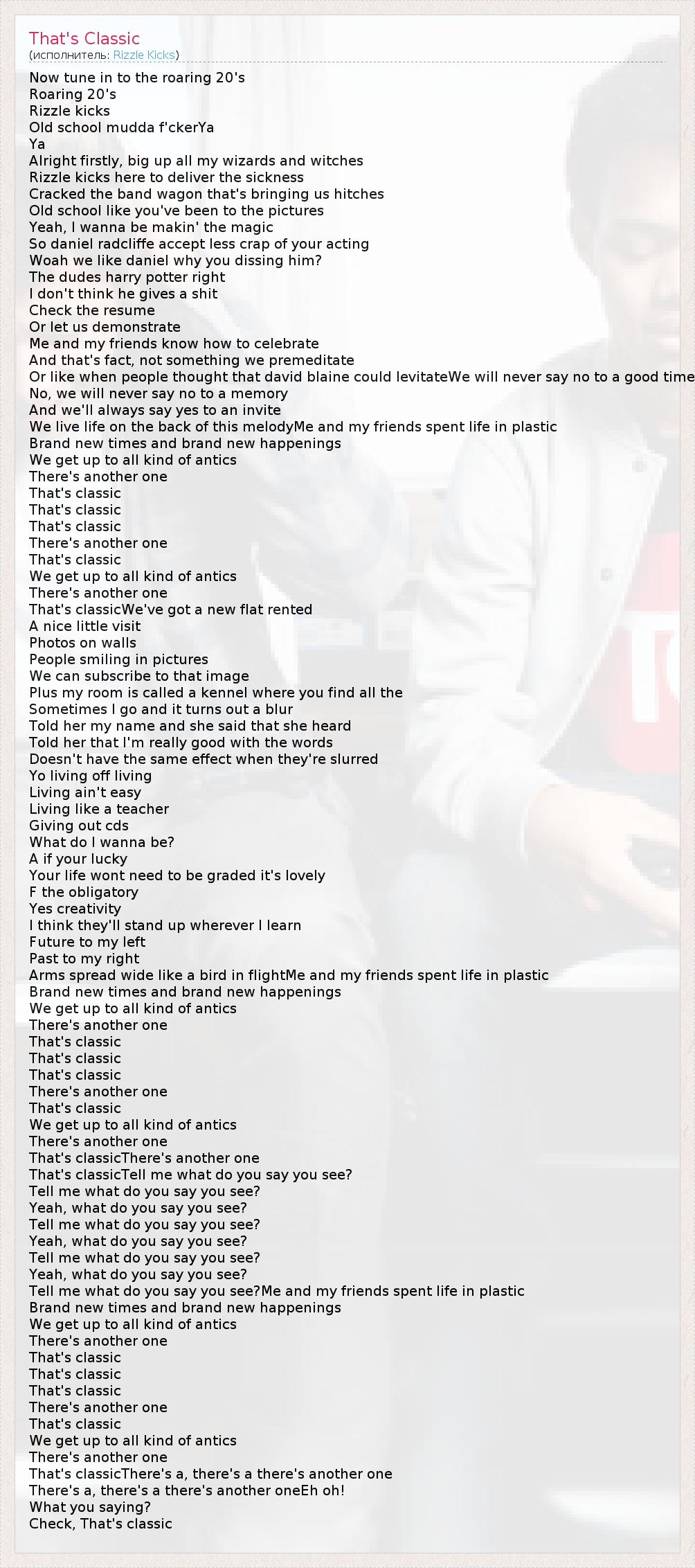 Это интересно:Rizzle Kicks — молодой хип хоп дуэт из Англии. Формально их группа появилась примерно в 1996 году, когда Джордан и Харли целыми днями играли на заднем дворе, будучи еще совсем детьми. Спустя 8 лет, после переезда в Брайтон, они снова встретились, а еще через 4 года — вместе закончили один колледж.Вскоре мальчики поняли насколько хорошо сочетаются их стили и официально стали называть себя Rizzle... продолжение