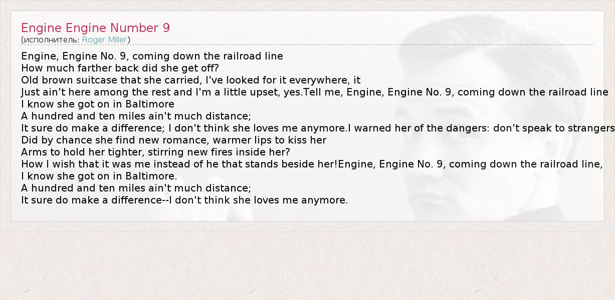 Engine, Engine No. 9, coming down the railroad line How much farther back did she get off? Old brown suitcase that she carried, I've looked for it everywhere, it Just ain't here among the rest and I'm a little upset, yes.Tell me, Engine, Engine No. 9, coming down the railroad line I know she got on in Baltimore A hundred and ten miles ain't much distance; It sure do make a difference; I don't think she loves me anymore.I warned her of the dangers: don't speak to strangers Did by chance she find new romance, warmer lips to kiss her Arms to hold her tighter, stirring new fires inside her? How I wish that it was me instead of he that stands beside her!Engine, Engine No. 9, coming down the railroad line, I know she got on in Baltimore. A hundred and ten miles ain't much distance; It sure do make a difference--I don't think she loves me anymore.