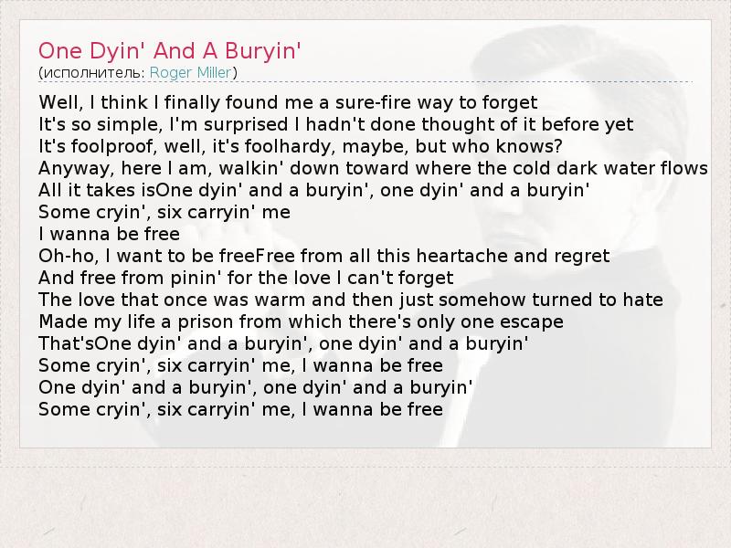 Well, I think I finally found me a sure-fire way to forget It's so simple, I'm surprised I hadn't done thought of it before yet It's foolproof, well, it's foolhardy, maybe, but who knows? Anyway, here I am, walkin' down toward where the cold dark water flows All it takes isOne dyin' and a buryin', one dyin' and a buryin' Some cryin', six carryin' me I wanna be free Oh-ho, I want to be freeFree from all this heartache and regret And free from pinin' for the love I can't forget The love that once was warm and then just somehow turned to hate Made my life a prison from which there's only one escape That'sOne dyin' and a buryin', one dyin' and a buryin' Some cryin', six carryin' me, I wanna be free One dyin' and a buryin', one dyin' and a buryin' Some cryin', six carryin' me, I wanna be free