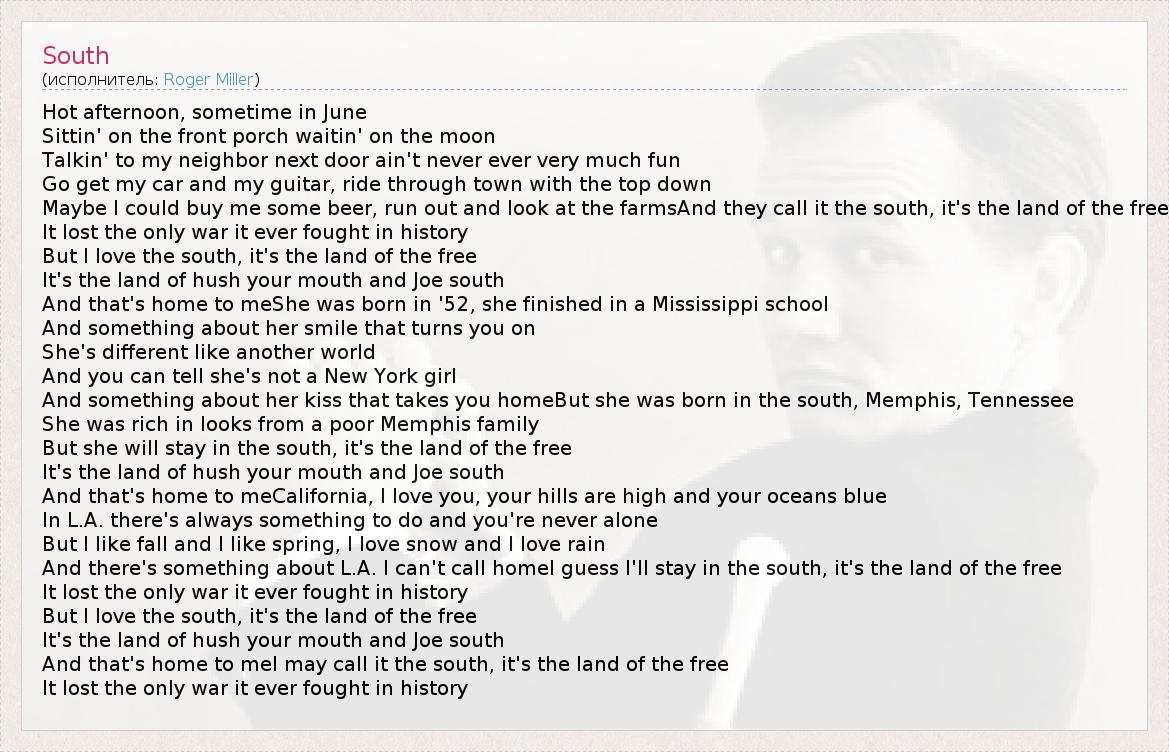 Это интересно:БиографияРоджер Миллер, младший из трех сыновей, родился в Форт Уорте, Техас. Его отец умер, когда Роджеру был всего год. Впоследствии, мальчик был отправлен жить к своим родственникам в Оклахому.Детство Миллера было одиноким и невесёлым. Grand Ole Opry и другие радио-шоу оказали на него сильнейшее влияние. Он отчаянно хотел стать музыкантом. В 17 лет он украл гитару, но затем сознался... продолжение