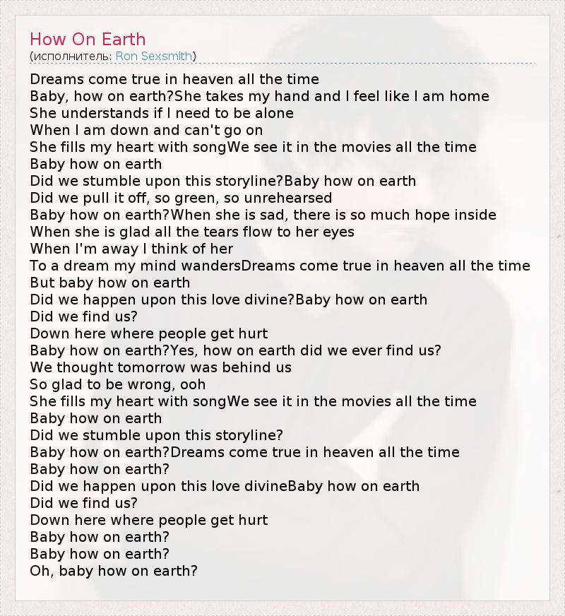 Dreams come true in heaven all the time Baby, how on earth?She takes my hand and I feel like I am home She understands if I need to be alone When I am down and can't go on She fills my heart with songWe see it in the movies all the time Baby how on earth Did we stumble upon this storyline?Baby how on earth Did we pull it off, so green, so unrehearsed Baby how on earth?When she is sad, there is so much hope inside When she is glad all the tears flow to her eyes When I'm away I think of her To a dream my mind wandersDreams come true in heaven all the time But baby how on earth Did we happen upon this love divine?Baby how on earth Did we find us? Down here where people get hurt Baby how on earth?Yes, how on earth did we ever find us? We thought tomorrow was behind us So glad to be wrong, ooh She fills my heart with songWe see it in the movies all the time Baby how on earth Did we stumble upon this storyline? Baby how on earth?Dreams come true in heaven all the time Baby how on earth? Did we happen upon this love divineBaby how on earth Did we find us? Down here where people get hurt Baby how on earth? Baby how on earth? Oh, baby how on earth?