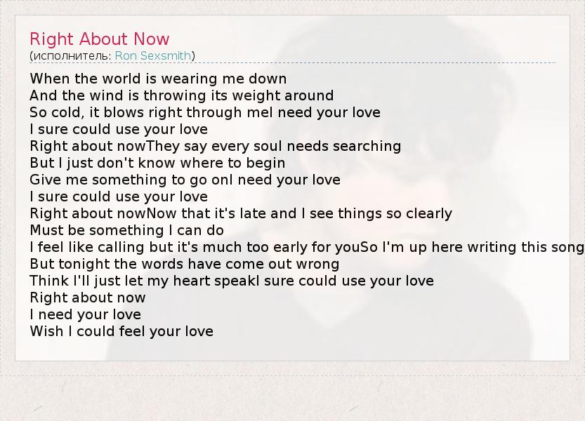 When the world is wearing me down And the wind is throwing its weight around So cold, it blows right through meI need your love I sure could use your love Right about nowThey say every soul needs searching But I just don't know where to begin Give me something to go onI need your love I sure could use your love Right about nowNow that it's late and I see things so clearly Must be something I can do I feel like calling but it's much too early for youSo I'm up here writing this song But tonight the words have come out wrong Think I'll just let my heart speakI sure could use your love Right about now I need your love Wish I could feel your love