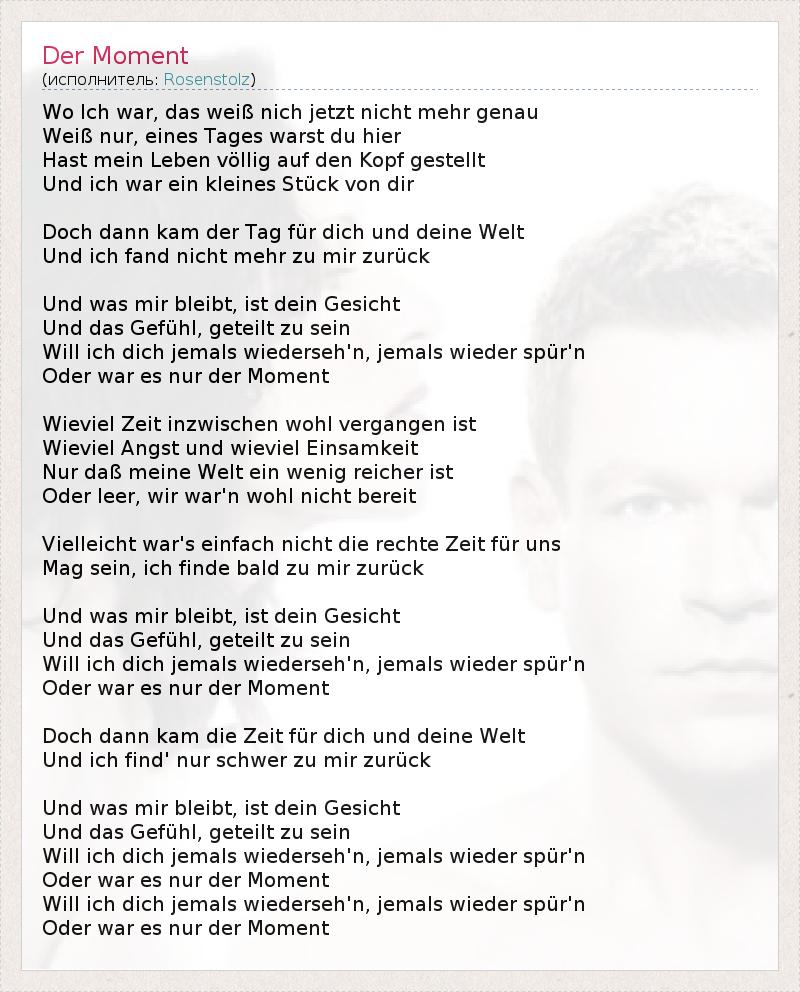 Wo Ich war, das weiß nich jetzt nicht mehr genau Weiß nur, eines Tages warst du hier Hast mein Leben völlig auf den Kopf gestellt Und ich war ein kleines Stück von dir Doch dann kam der Tag für dich und deine Welt Und ich fand nicht mehr zu mir zurück Und was mir bleibt, ist dein Gesicht Und das Gefühl, geteilt zu sein Will ich dich jemals wiederseh'n, jemals wieder spür'n Oder war es nur der Moment Wieviel Zeit inzwischen wohl vergangen ist Wieviel Angst und wieviel Einsamkeit Nur daß meine Welt ein wenig reicher ist Oder leer, wir war'n wohl nicht bereit Vielleicht war's einfach nicht die rechte Zeit für uns Mag sein, ich finde bald zu mir zurück Und was mir bleibt, ist dein Gesicht Und das Gefühl, geteilt zu sein Will ich dich jemals wiederseh'n, jemals wieder spür'n Oder war es nur der Moment Doch dann kam die Zeit für dich und deine Welt Und ich find' nur schwer zu mir zurück Und was mir bleibt, ist dein Gesicht Und das Gefühl, geteilt zu sein Will ich dich jemals wiederseh'n, jemals wieder spür'n Oder war es nur der Moment Will ich dich jemals wiederseh'n, jemals wieder spür'n Oder war es nur der Moment