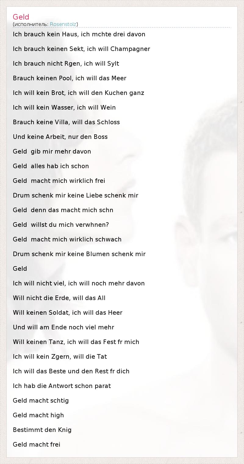 Ich brauch kein Haus, ich mchte drei davon Ich brauch keinen Sekt, ich will Champagner Ich brauch nicht Rgen, ich will Sylt Brauch keinen Pool, ich will das Meer Ich will kein Brot, ich will den Kuchen ganz Ich will kein Wasser, ich will Wein Brauch keine Villa, will das Schloss Und keine Arbeit, nur den Boss Geld gib mir mehr davon Geld alles hab ich schon Geld macht mich wirklich frei Drum schenk mir keine Liebe schenk mir Geld denn das macht mich schn Geld willst du mich verwhnen? Geld macht mich wirklich schwach Drum schenk mir keine Blumen schenk mir Geld Ich will nicht viel, ich will noch mehr davon Will nicht die Erde, will das All Will keinen Soldat, ich will das Heer Und will am Ende noch viel mehr Will keinen Tanz, ich will das Fest fr mich Ich will kein Zgern, will die Tat Ich will das Beste und den Rest fr dich Ich hab die Antwort schon parat Geld macht schtig Geld macht high Bestimmt den Knig Geld macht frei